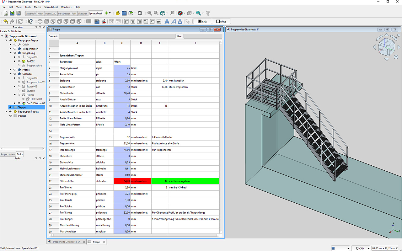 meine Versuche mit dem 3D-Treppenbau. Da hier viele Abmessungen in gegenseitiger Abhängigkeit stehen, verwendete ich hier die Tabellen-Funktion von FreeCad. Damit