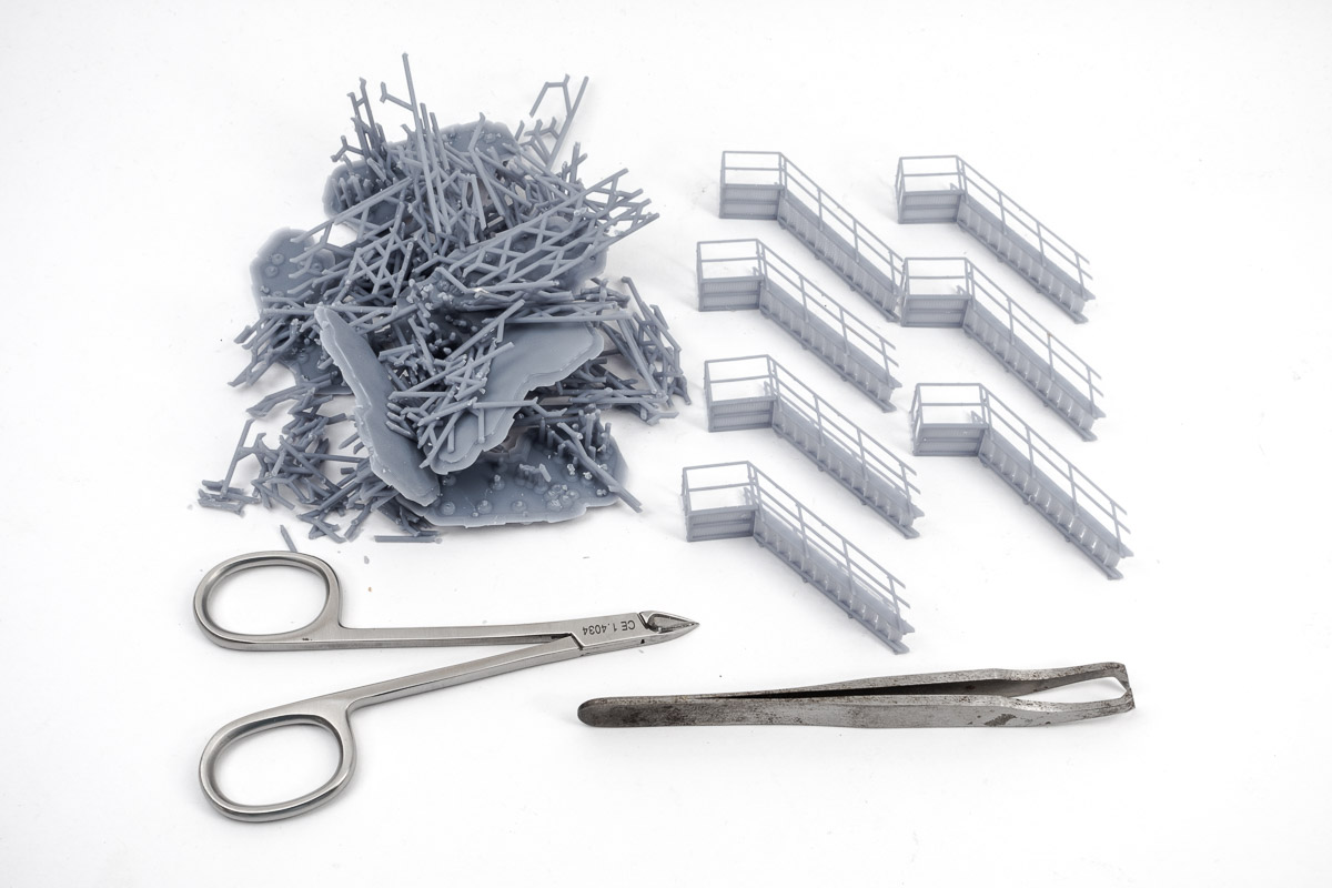 mit einer kleinen scharfen Zange durchschneiden und darauf achten, die filigrane Treppe nicht zu beschädigen. Nach dem abschließenden Aushärten sind dann noch zahlreiche kleine