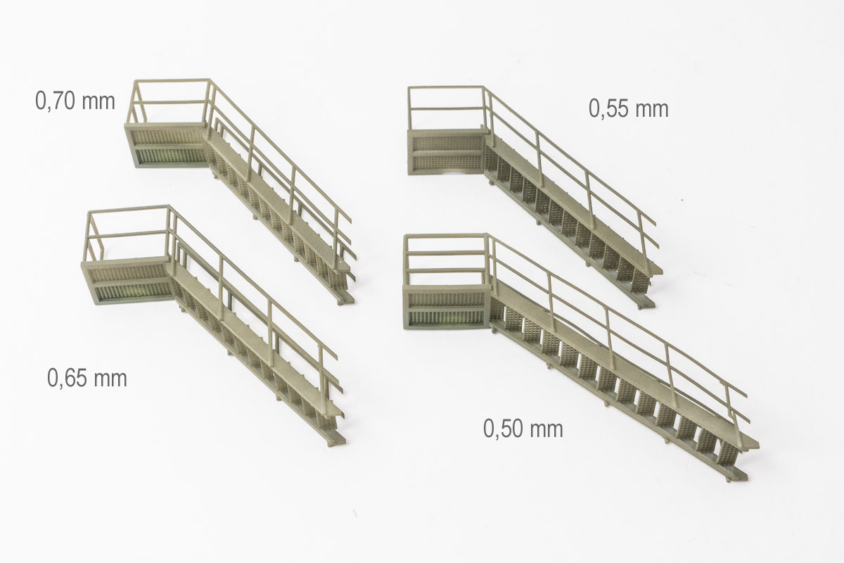 aber noch stabil und gut zu hantieren. Eine Testreihe hinunter bis 0,5 mm konnte ich problemlos drucken, aber die dünnste Variante war beim Entgittern und Versäubern sehr bruchgefährdet.