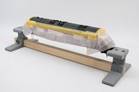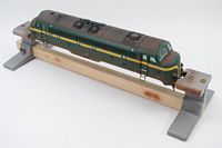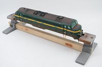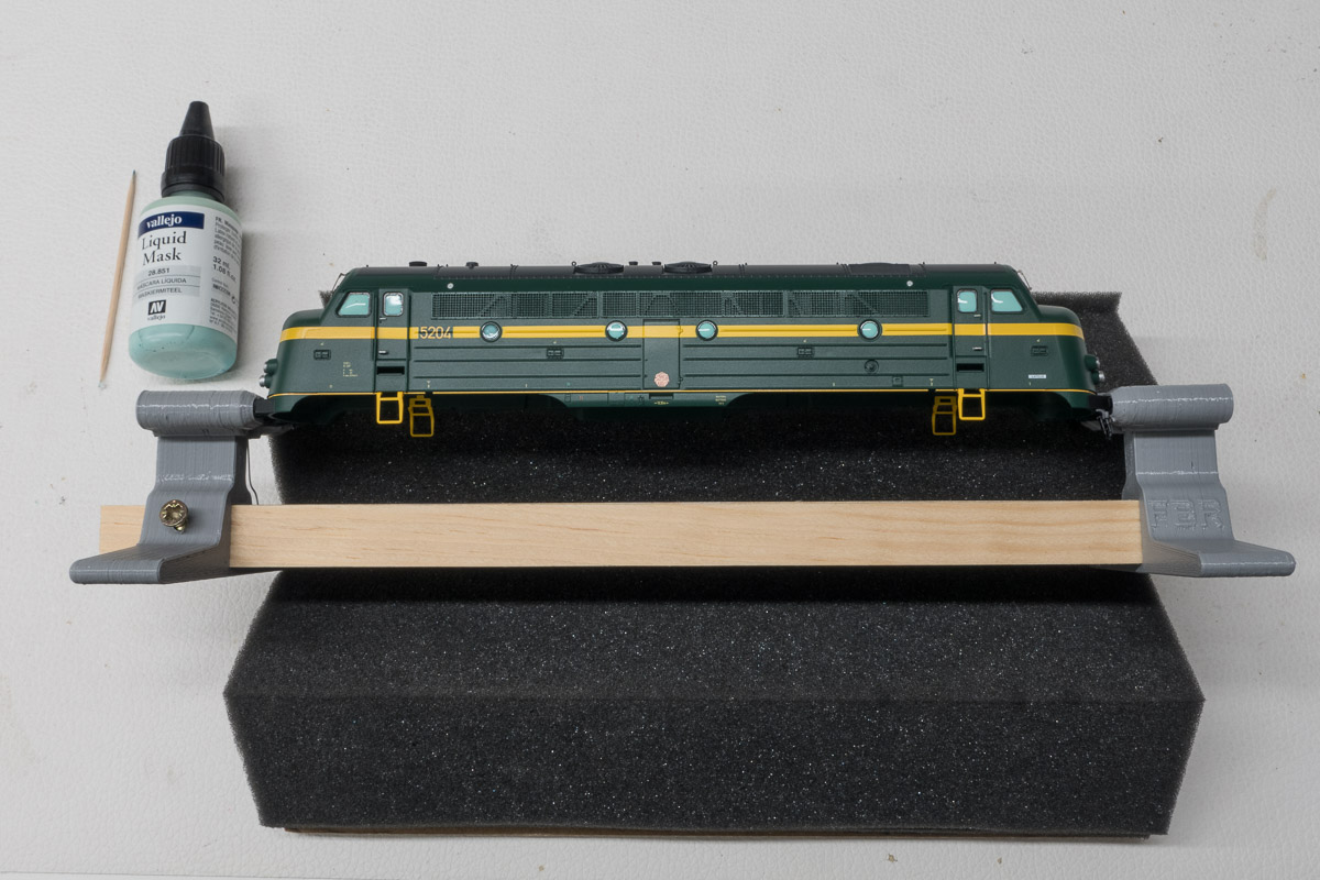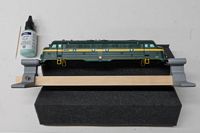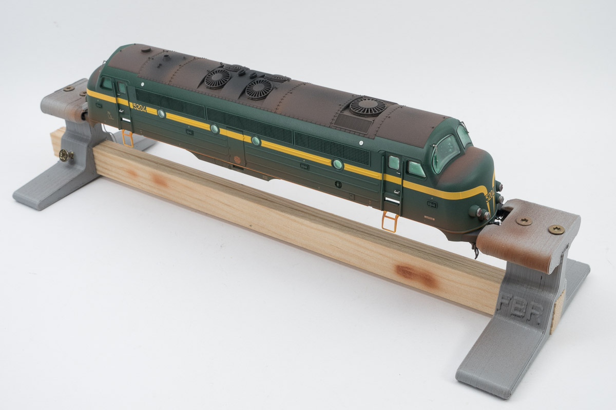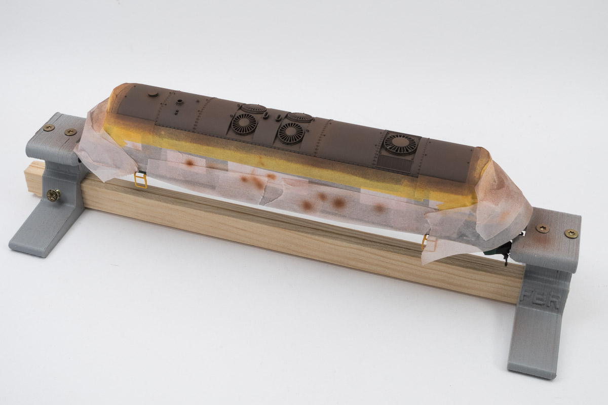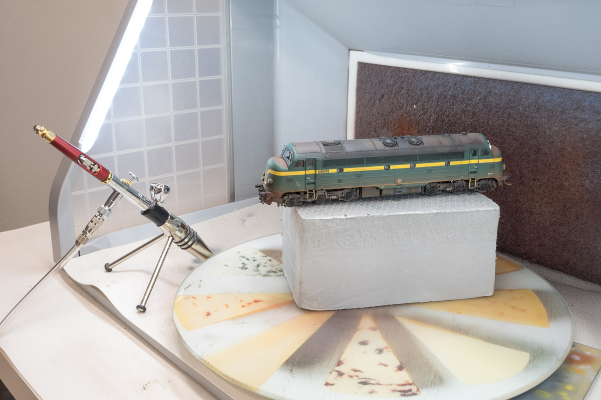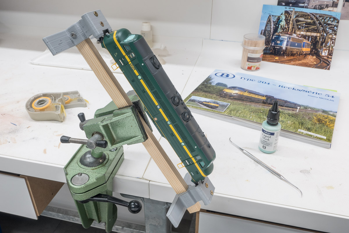 Mit der Halterung konnte ich das Lokgehäuse schräg einspannen und hatte so eine optimale Arbeitsposition für die Spritzpistole. Dieser Schritt war schwierig, da ich freihändig die