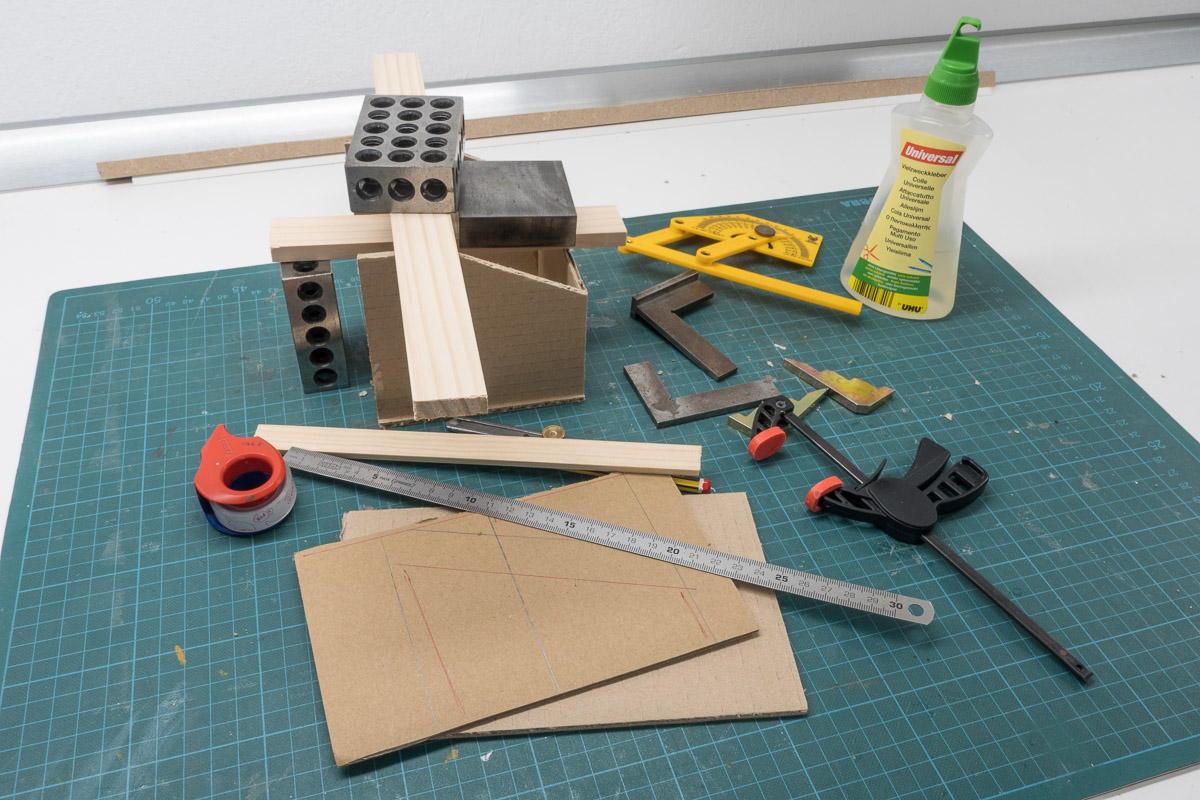 Nachdem die Abmessungen feststanden, habe ich den Kern des Dachaufbaus aus 5 mm Hartfaser ausgesägt, das Material lag zufällig als Reststück in der Ecke. Die