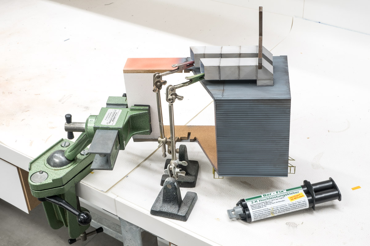 Wartungsbühne, kleine Details und der Kern für die Würfelbude lieferte hingegen der FDM-Drucker. Die Würfelbude wurde mit Resten des Falzblechs passend