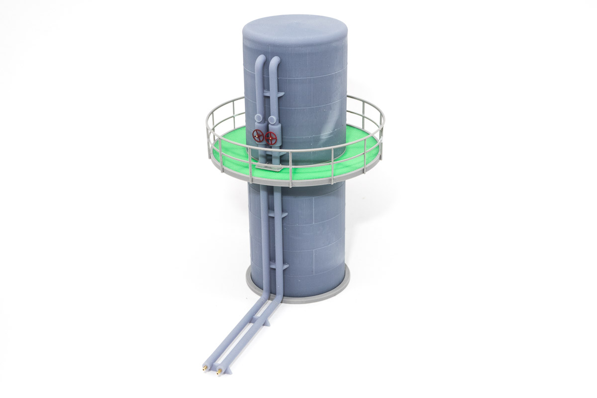 Das runde Türmchen mit den Scheißnähten und die Rohrleitungen habe ich mit dem alten Anycubic Resindrucker angefertig. Die filigranen Geländer, die