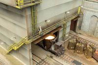 aufgesteckt, dort kann die Rohrleitung Richtung Hochofen verlängert werden. Am anderen Ende sollen die Rohre in der Konverterhalle verschwinden. Für den Einbau auf der Anlage