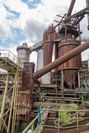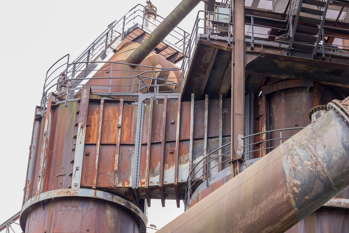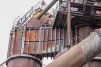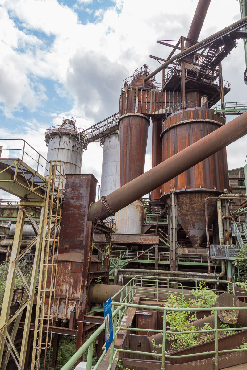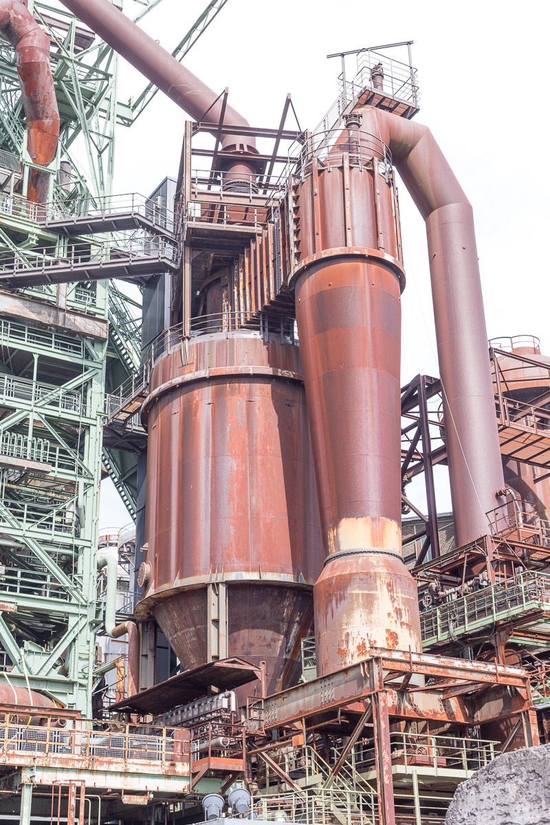 linken und rechten Seite des Hochofens. Große Gasabzugsrohre führen von der Spitze des Hochofens auf beiden Seiten oben in die Staubsäcke. Über eine spezielle Verbindungsbrücke gelangt das
