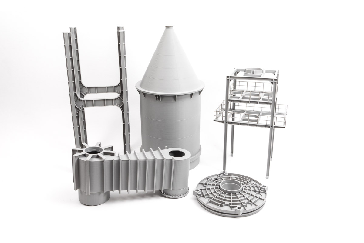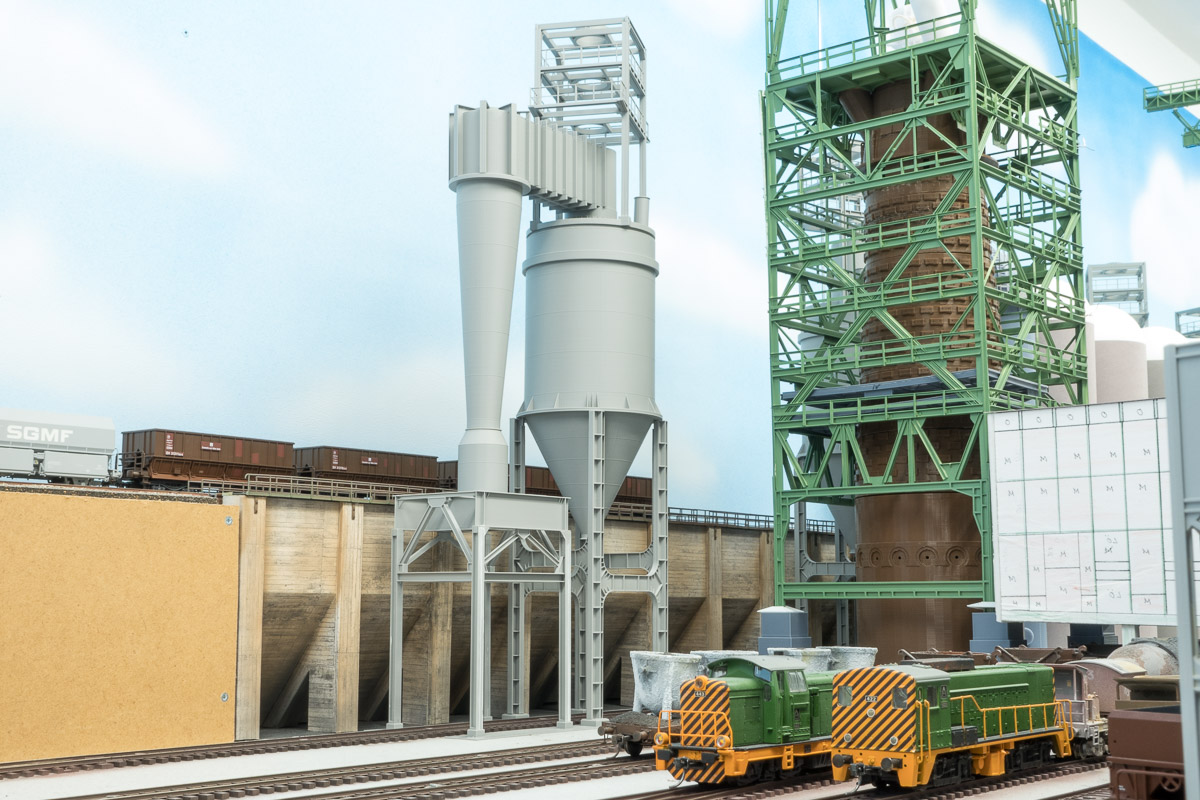 Im Modell orientiere ich mich weitgehend an der Situation in der Henrichshütte. Je eine Kombination aus Staubsack und Wirbler steht rechts und links neben dem Hochofen, dabei