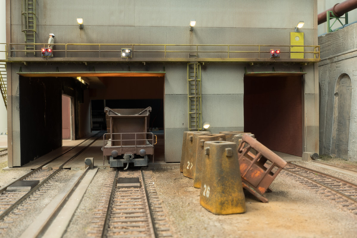 Für die Konverterhalle standen noch einige Aufgaben auf den Arbeitszettel: Die Einfahrten sollten noch mit Hallensignalen gesichert werden und ein zusätzlicher Dachaufbau