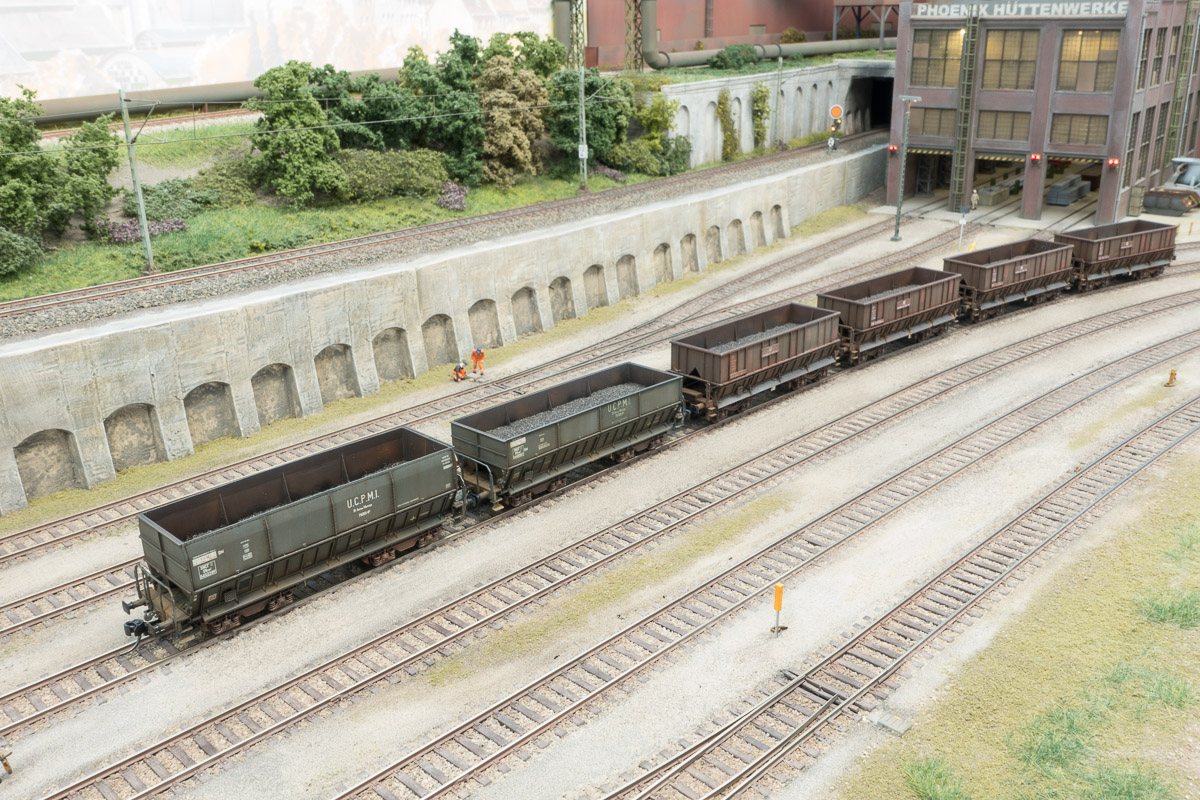 Schattenbahnhof und Werkbahn. Auf dem DB-Abschnitt werden Diesel- und Dampfloks eingesetzt, die mit Kadee-Kupplungen ausgestattet sind. Auf dem Hüttengelände sorgt dann die Werkbahn für die