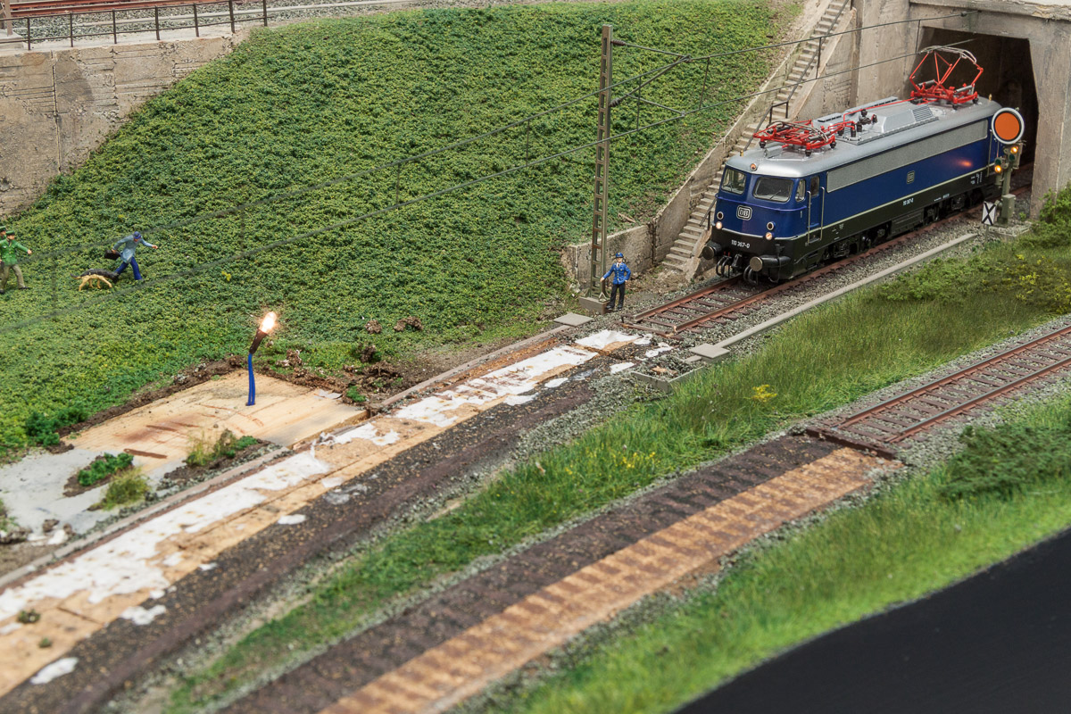 Während der Zeit der Umbauarbeiten ruhte der Anlagenbetrieb, da die Hauptstrecke zum ersten Mal seit vielen Jahren wieder unterbrochen war. Das mußte auch der Lokführer der 110 367