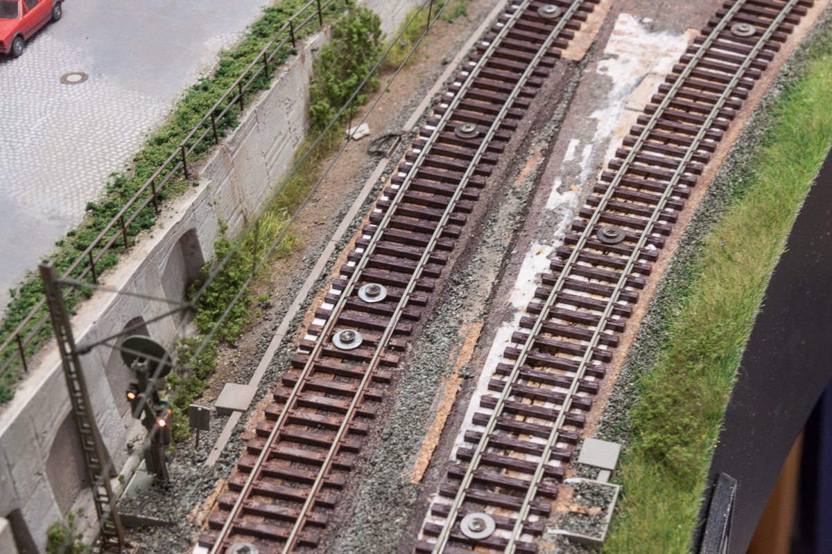 Kreisverkehr mit einer Klappbrücke vor der Tür zum Anlagenraum geplant. Dann hätte die Weichenverbindung eine wichtige Funktion gehabt. Leider gab es bei den Selbstbauweichen immer