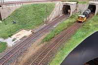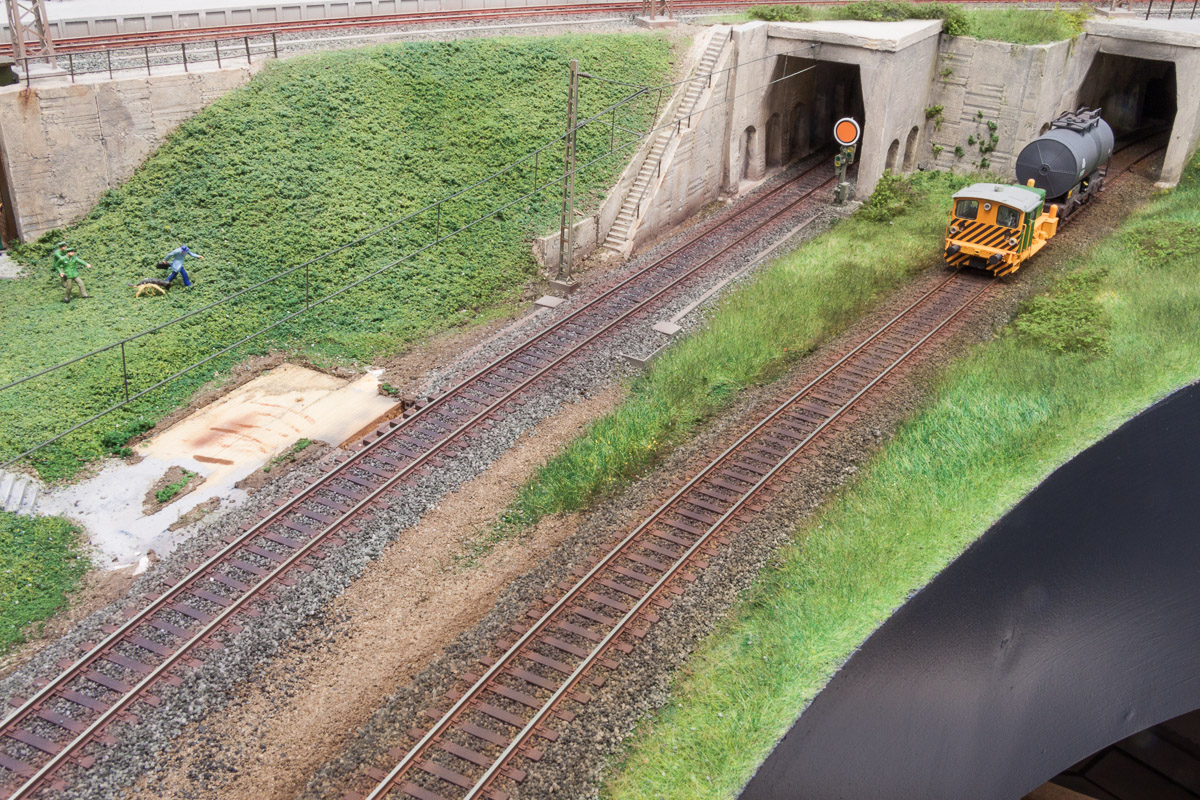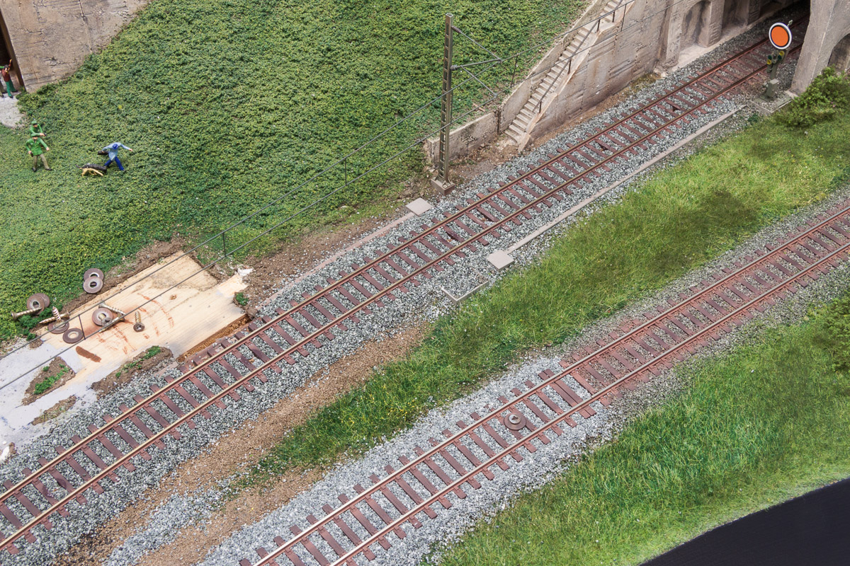 entfernt und die Graslandschaft mit dem Elektrostat ergänzt. Besonders der Hang hinter dem Stellwerk, bislang nur aus Flocken gestaltet, wurde kräftigt