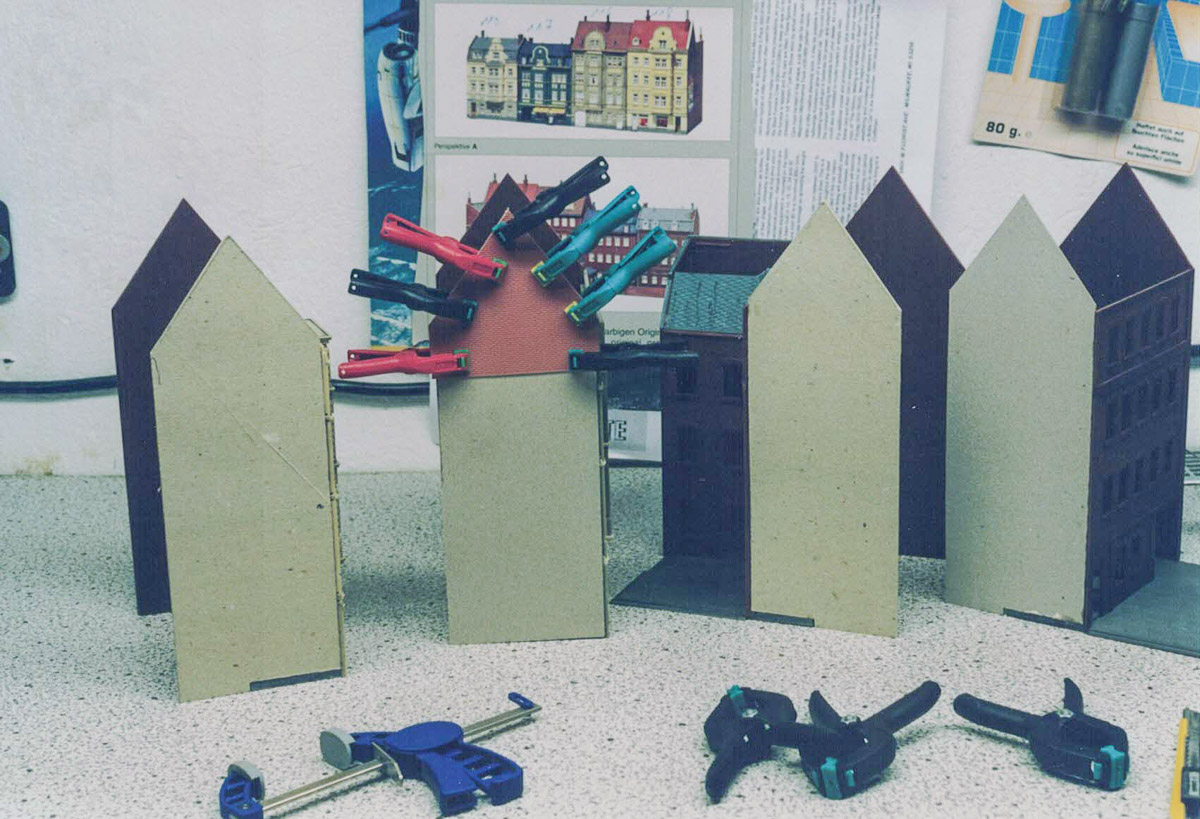 Einige Seitenwände wurden aus Pappe ergänzt, fast alle waren später nicht mehr sichtbar. Die zusätzlichen Dachflächen entstanden aus handelsüblichen geprägten Kunststoffplatten. Die Häuser