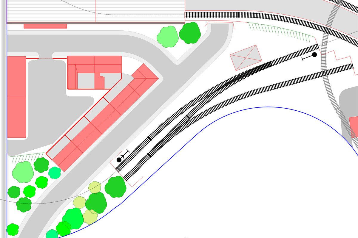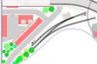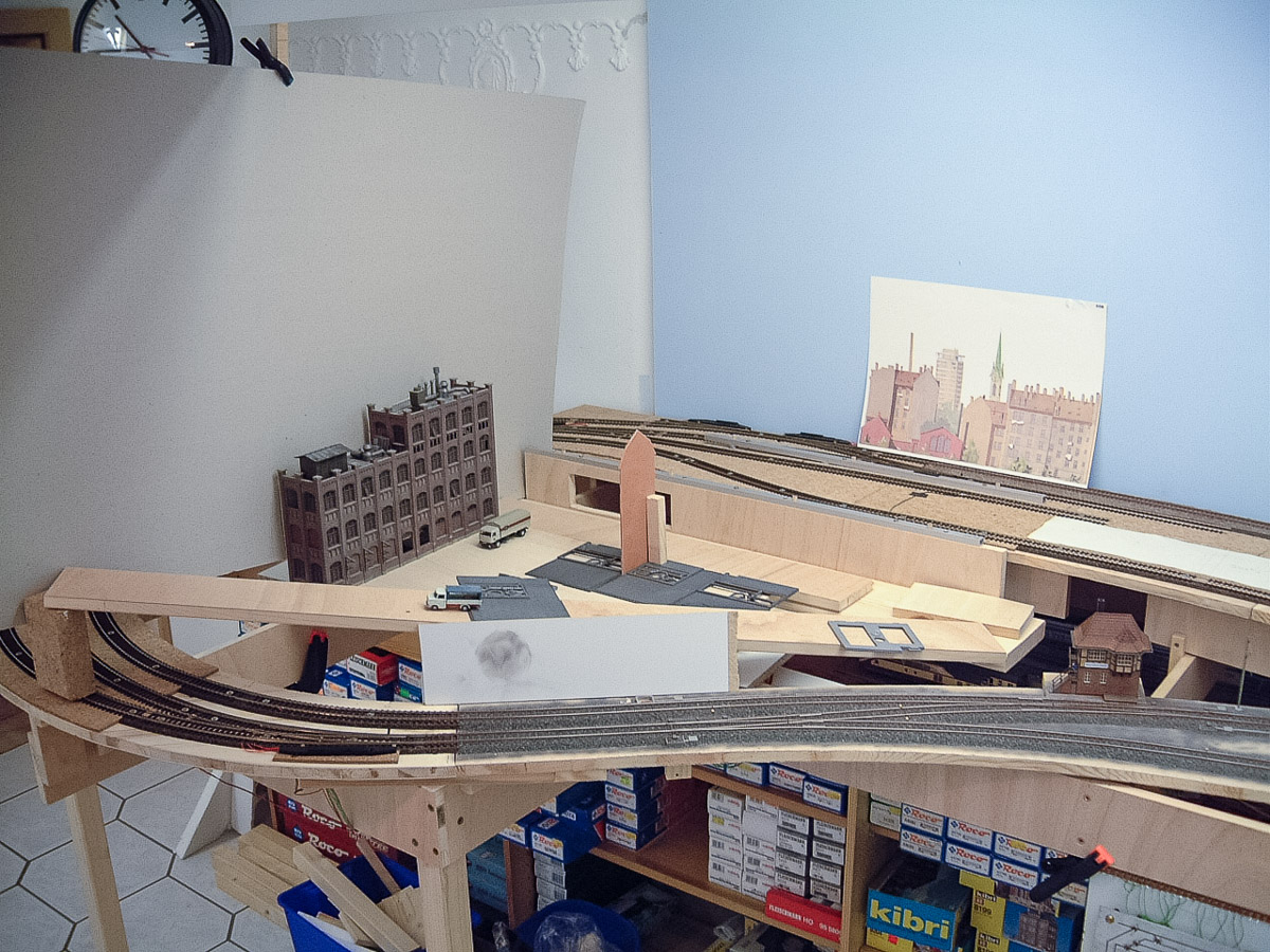 ich die Grundplatten und (halb)fertigen Gebäude für eine Stellprobe. Auch der Straßenverlauf über die Gleise hinweg - lichte Höhe! - und die Stützmauern wurde auf ausreichenden Platz
