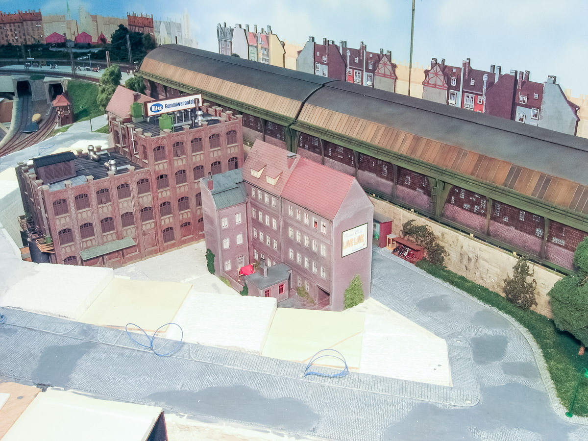 Die Montage der Häuser erfolgte dann von hinten nach vorn. Zuerst wurde die Fabrik und die beiden Häuser an der Vulkanstraße eingebaut und mit Beleuchtung versehen. Dann folgte die Gestaltung