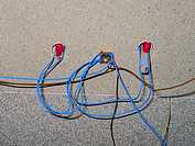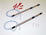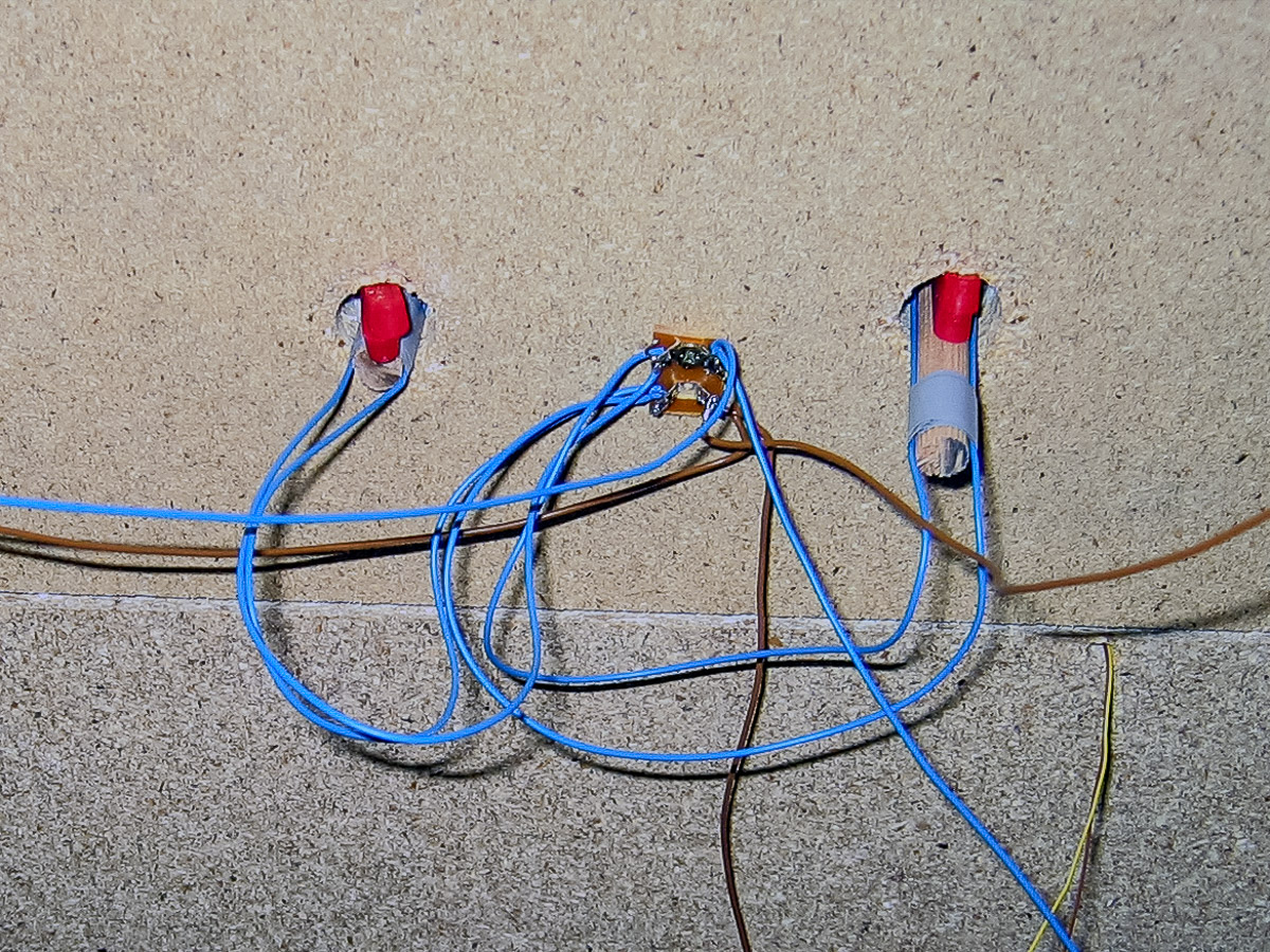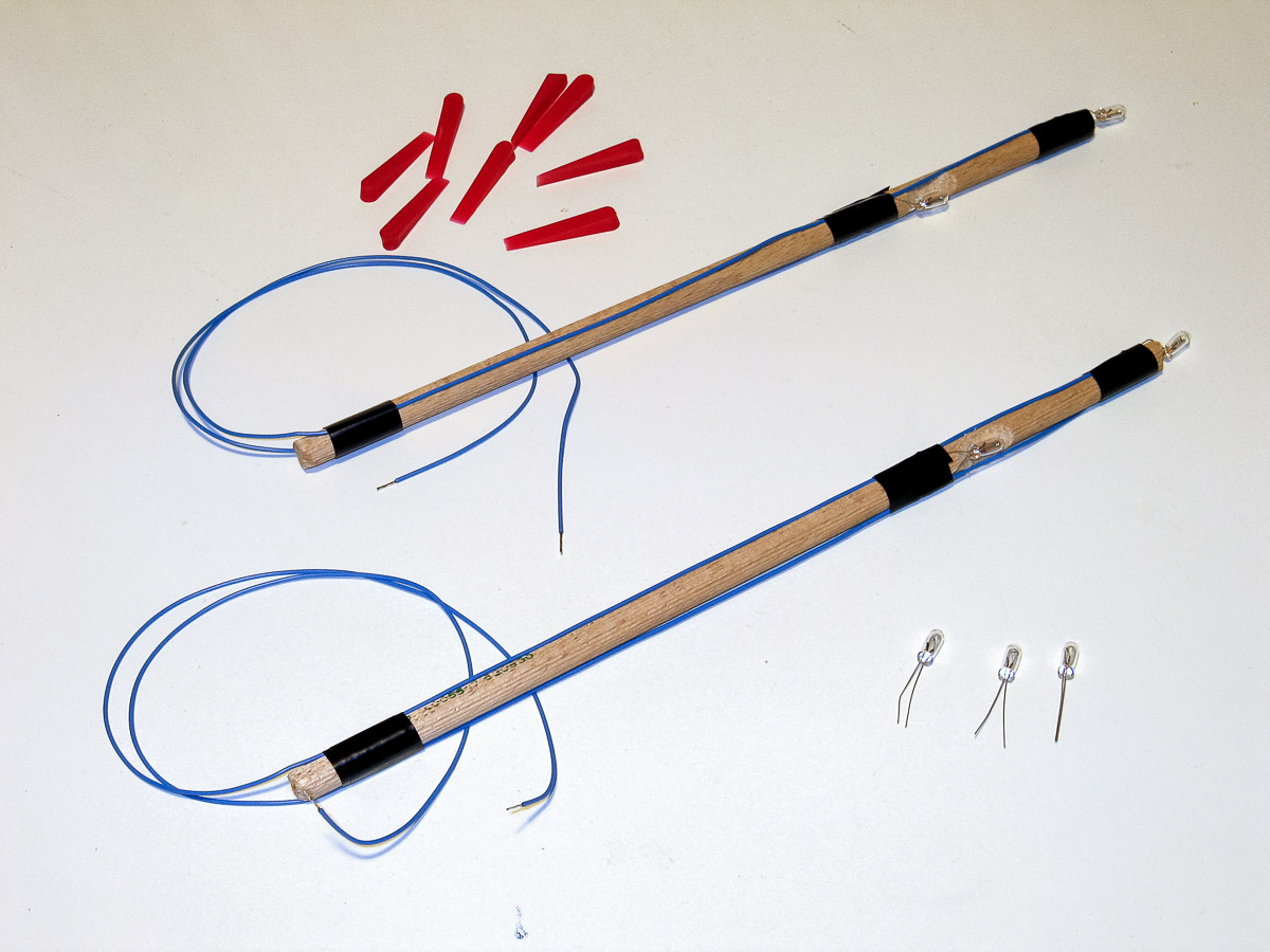 Geriffelte Rundhölzer (8mm) wurden mit einfachen Kabelbirnchen 87655 von Conrad versehen. Die Birnchen wurden an reichlich lang bemessene Litzen gelötet und mit Isolierband an den Rundhölzern