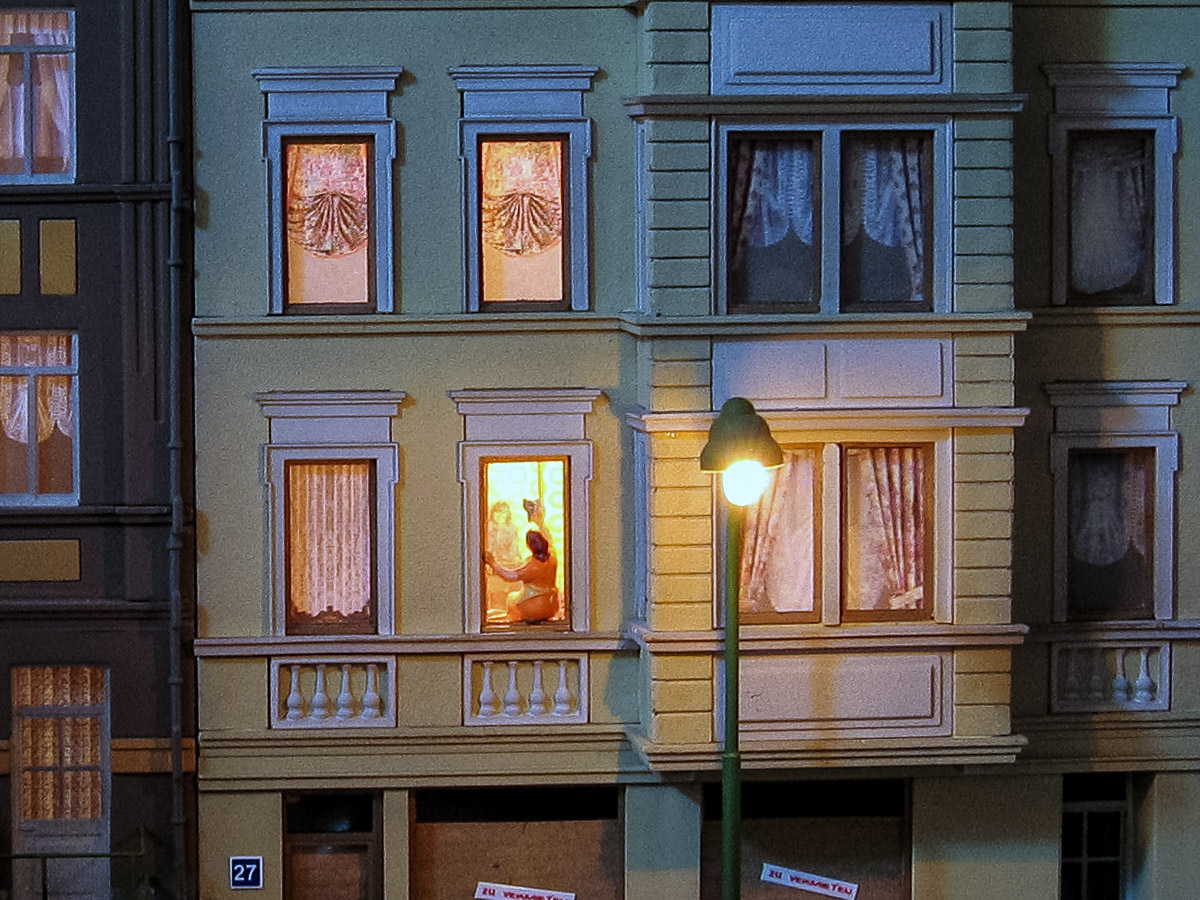 Die Innenbeleuchtung der Häuser ist gedämpft und nur bei abgedunkeltem Raum sichtbar. Die meisten Fensteröffnungen sind von innen mit schwarzer Pappe abgedeckt, lediglich durch einen Teil der