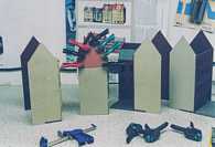 befestigt. Durch Löcher an der Anlagenunterseite wurden diese Leuchtstäbe von unten in die Gebäude geschoben und dann mit kleinen Plastikkeilen (Laminatzubehör im Baumarkt) fixiert. Bei Defekten