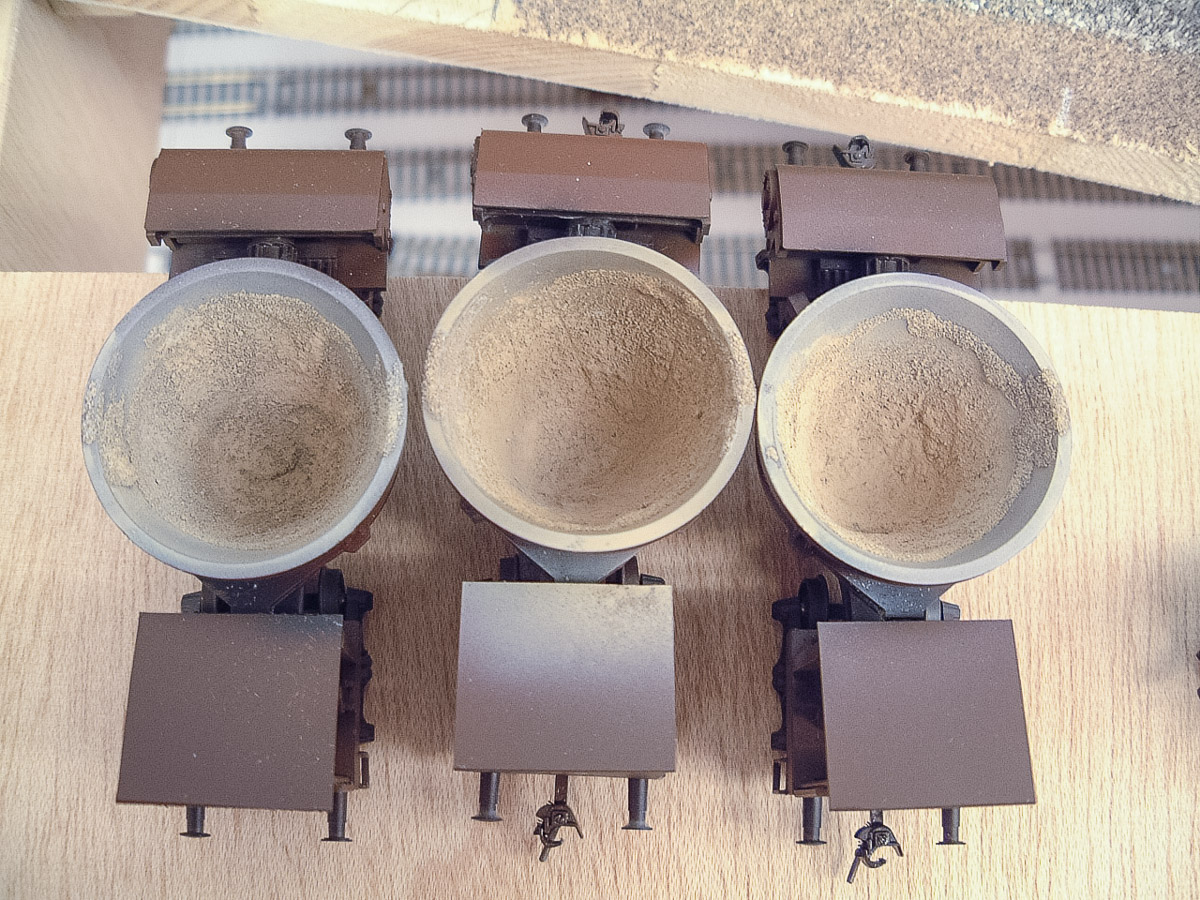 Die Modelle erhielten zunächst eine mittelgraue Grundierung mit Revellfarbe. Anschließend wurden dann mit dem Airbrush Rostschichten aus verschieden Braun-Rot-Tönen aufgebracht,