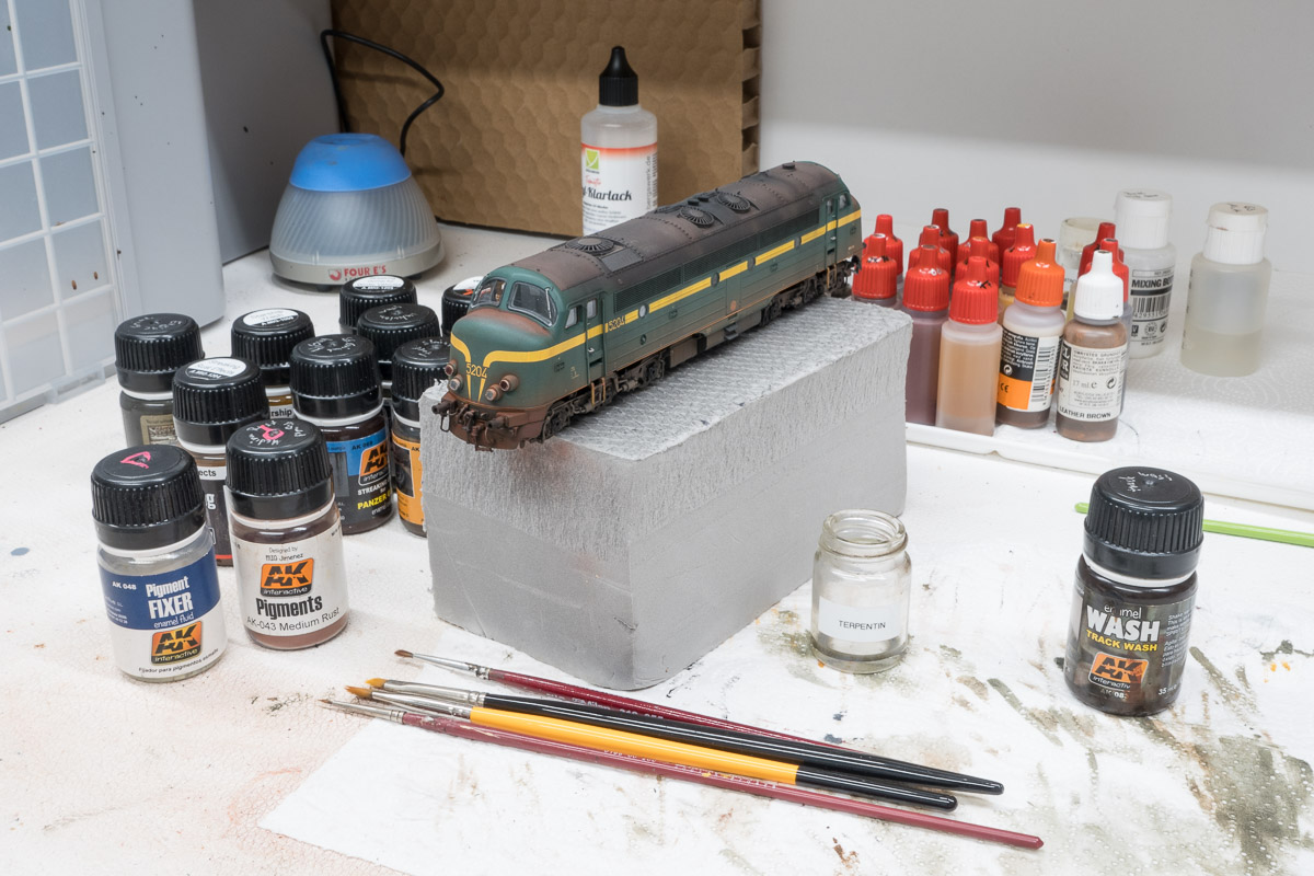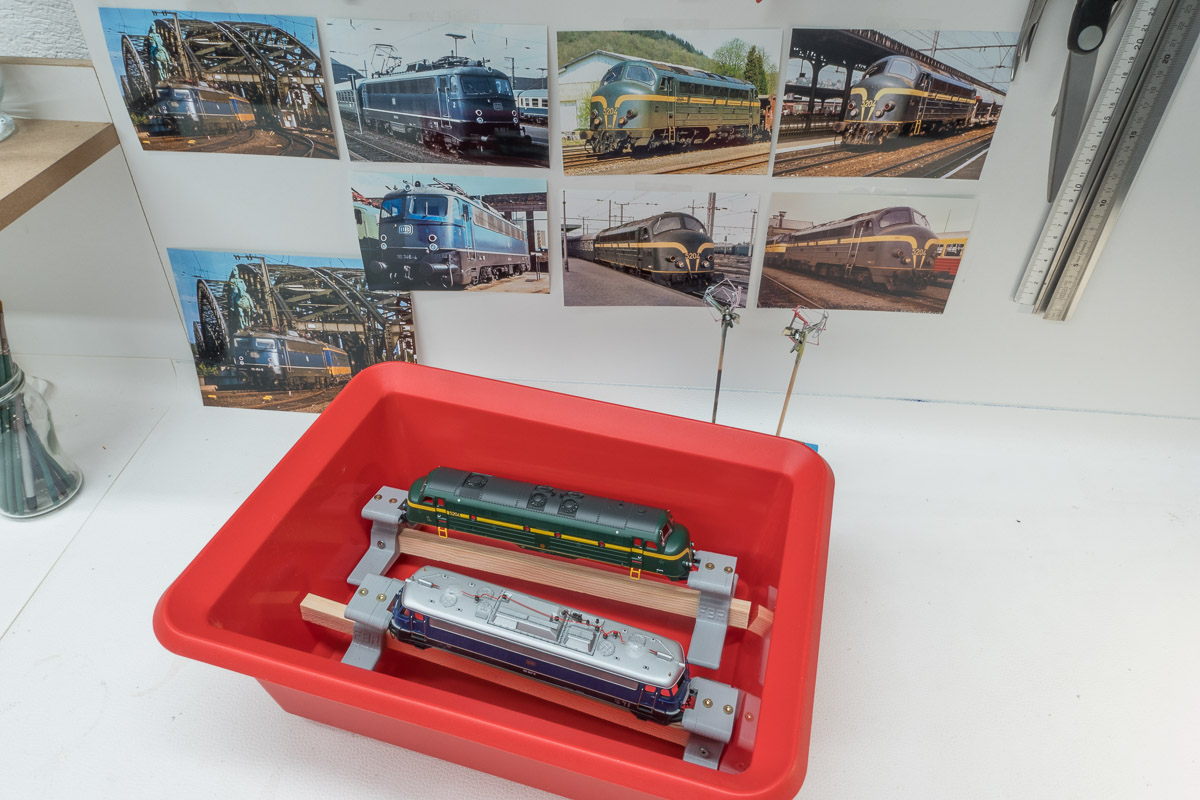 Diese Lokomotiven waren um 1980 in einem schlechten äußeren Zustand. Daher ist eine kräftige Patinierung des Modells sehr wichtig für eine überzeugende Wirkung. Hier beschreibe ich,