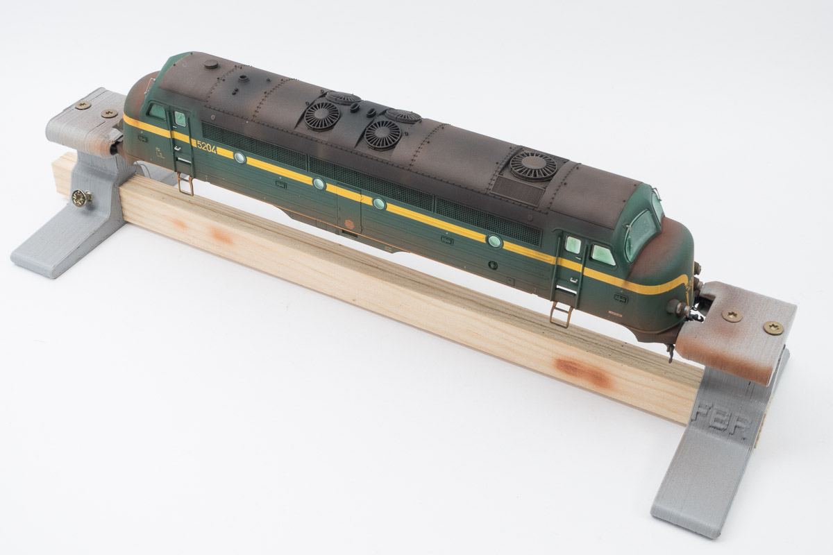Mit der Halterung konnte ich das Lokgehäuse schräg einspannen und hatte so eine optimale Arbeitsposition für die Spritzpistole. Dieser Schritt war schwierig, da ich freihändig die