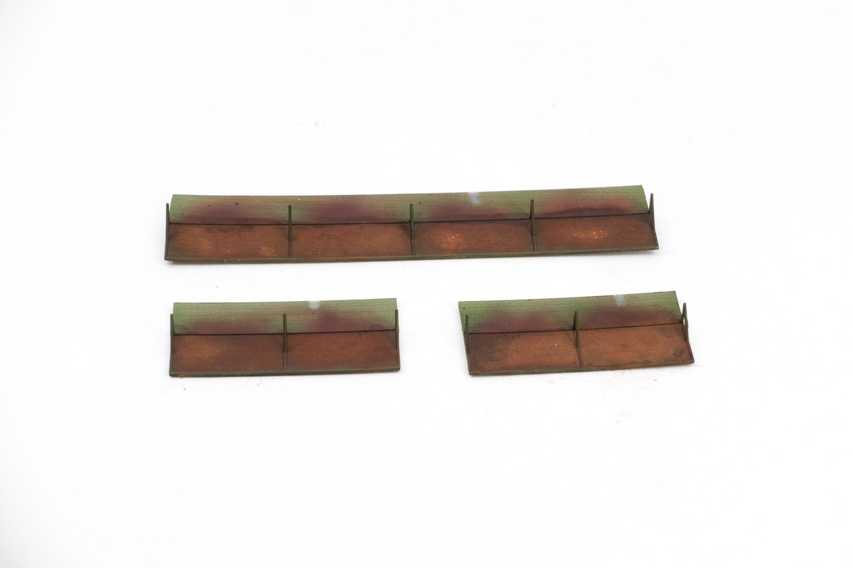 Der Walthers-Bausatz enthielt viele Teile aus flachen, grauen Polystyrol-Wellblech. Klebenasen und Angußstellen auf der Rückseite wurden abgeschnitten und die