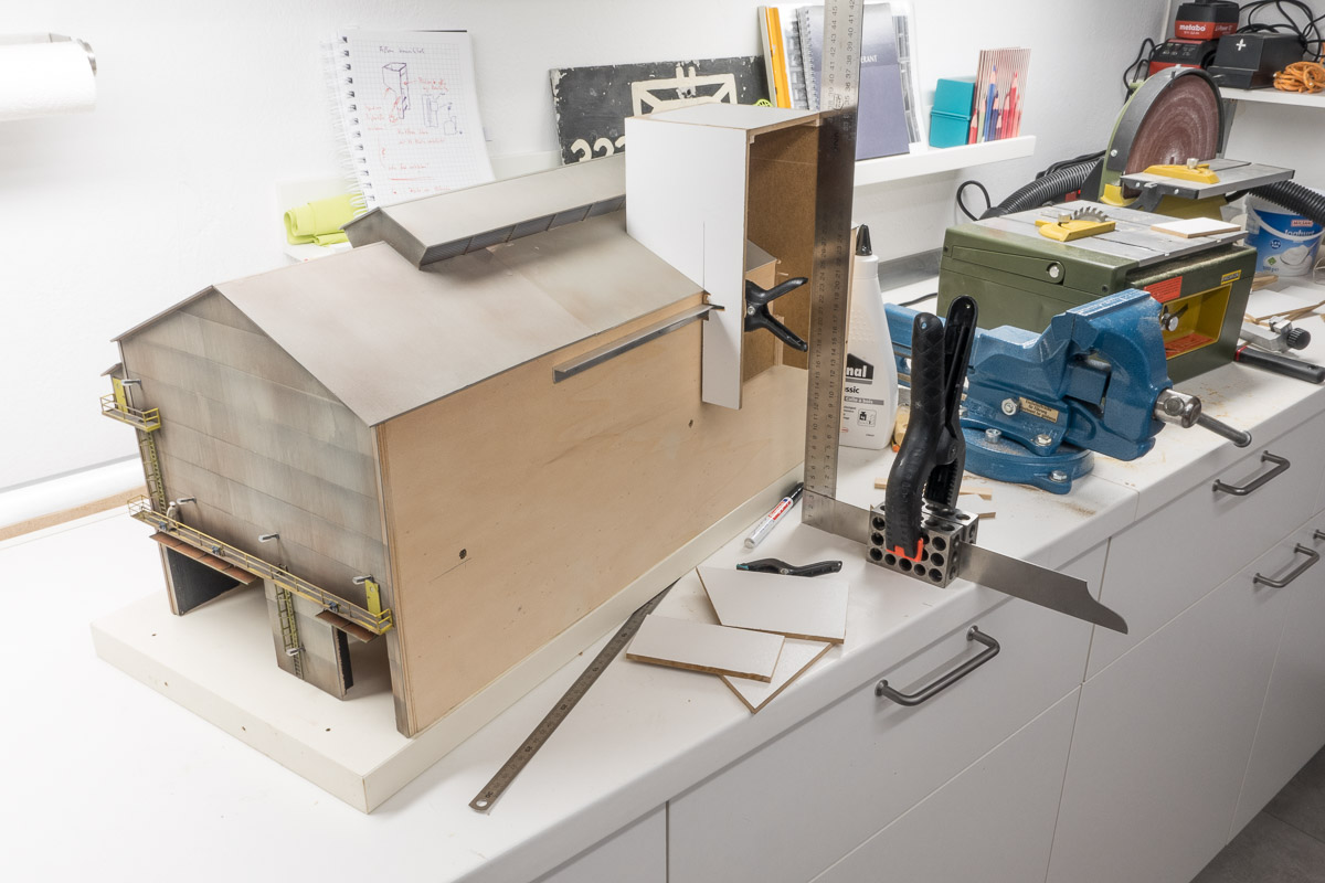 Wartungsbühne, kleine Details und der Kern für die Würfelbude lieferte hingegen der FDM-Drucker. Die Würfelbude wurde mit Resten des Falzblechs passend