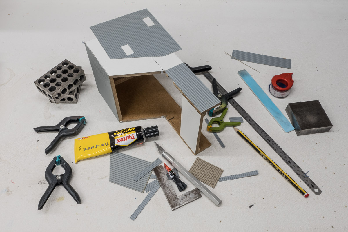 Im Fundus fand sich eine Falzblechplatte aus Polystyrol von NOCH, nach meinen Aufzeichnungen im Jahr 2001 auf Vorrat gekauft. Das Material ließ sich leicht zuschneiden,