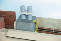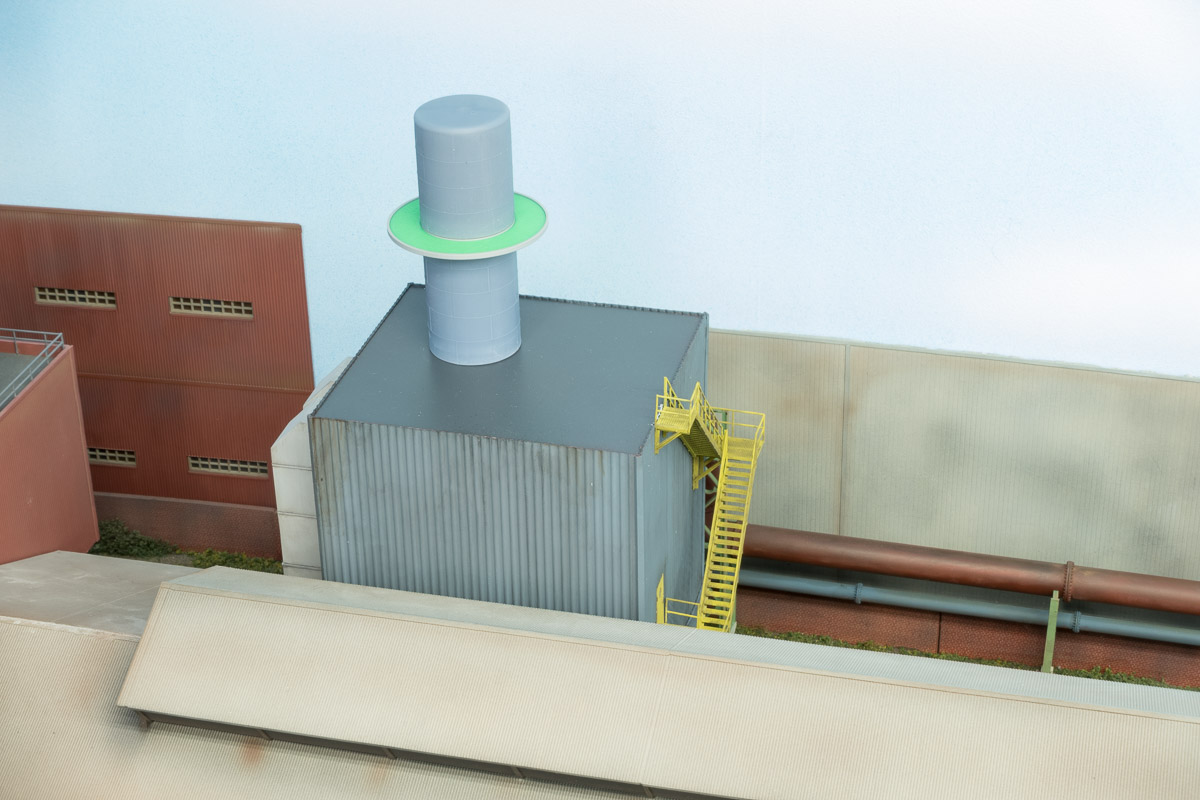 Die komplette Konverterhalle konnte ich nun auf die Anlage setzen, um die Gesamtwirklung zu beurteilen. Hier ist besonders der Übergang zur Rohrleitung wichtig, die