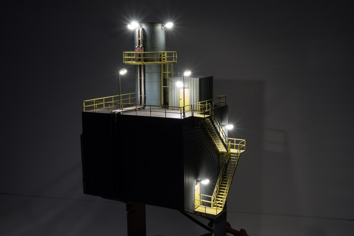 Entlang der Laufstege und Treppen habe ich die bereits bei der Stranggußhalle verwendeten Wandleuchten aus eigener Fertigung montiert. Im Innenraum sorgen weiße PLCC2-LEDs