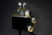 Die Würfelbude war als nächstes an der Reihe, hier musste ich darauf achten, daß die kleine Kabelbrücke bis zum Türmchen reicht. Zum Schluss habe ich noch zwei Mastleuchten montiert.
