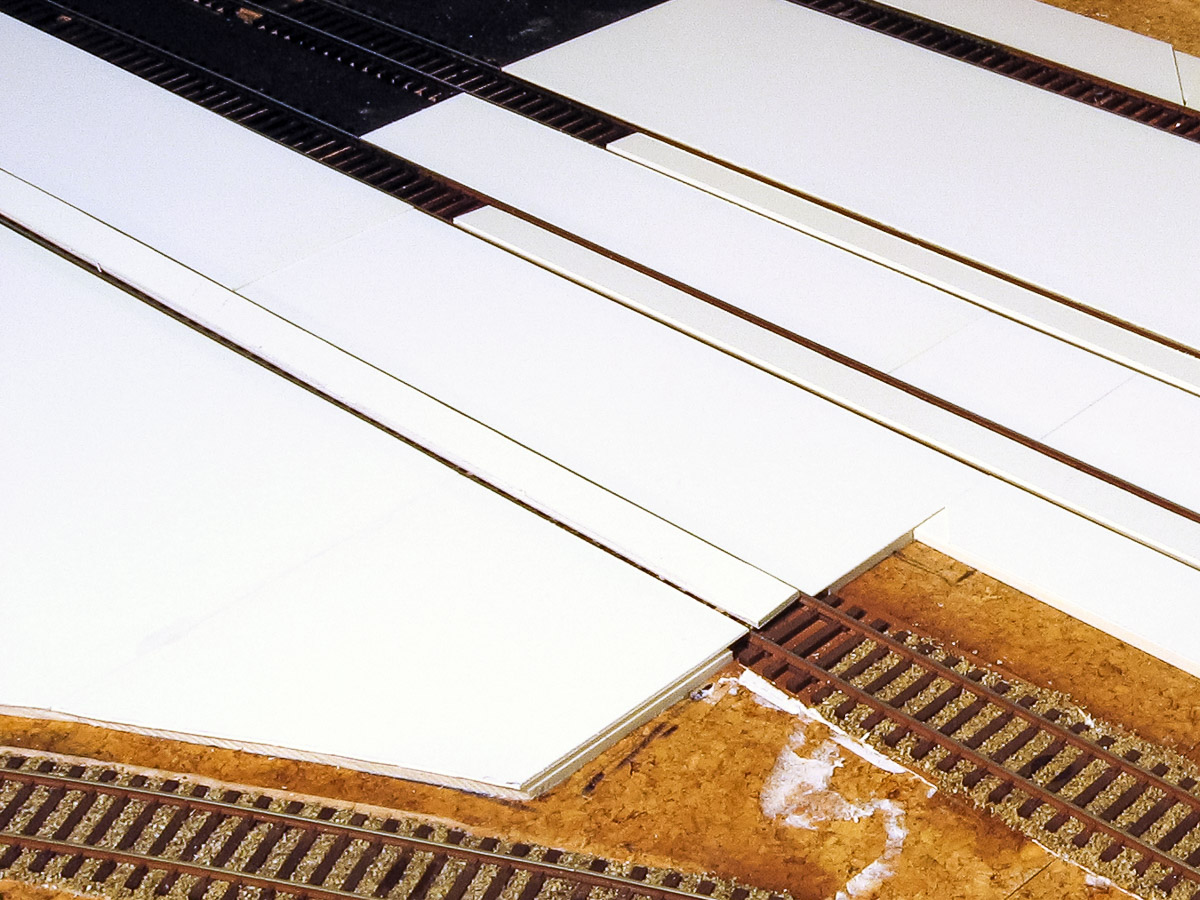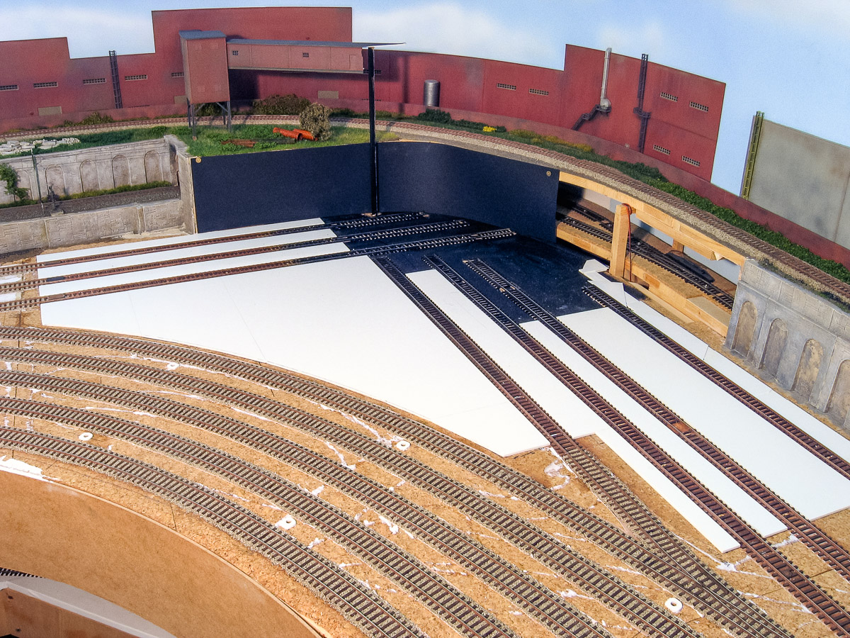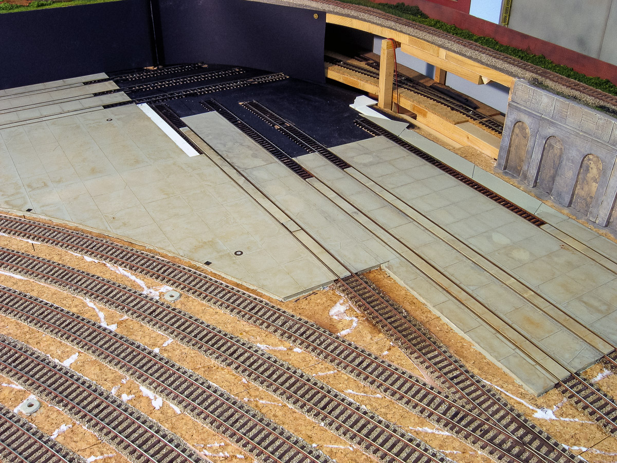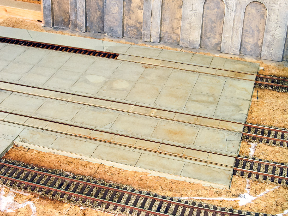 3mm dicken Material gefertigt. Damit wurde der Vorplatz, aber auch die Flächen zwischen benachbarten Gleisen abgedeckt. Die Oberkante der Plastikplatten liegt etwas höher