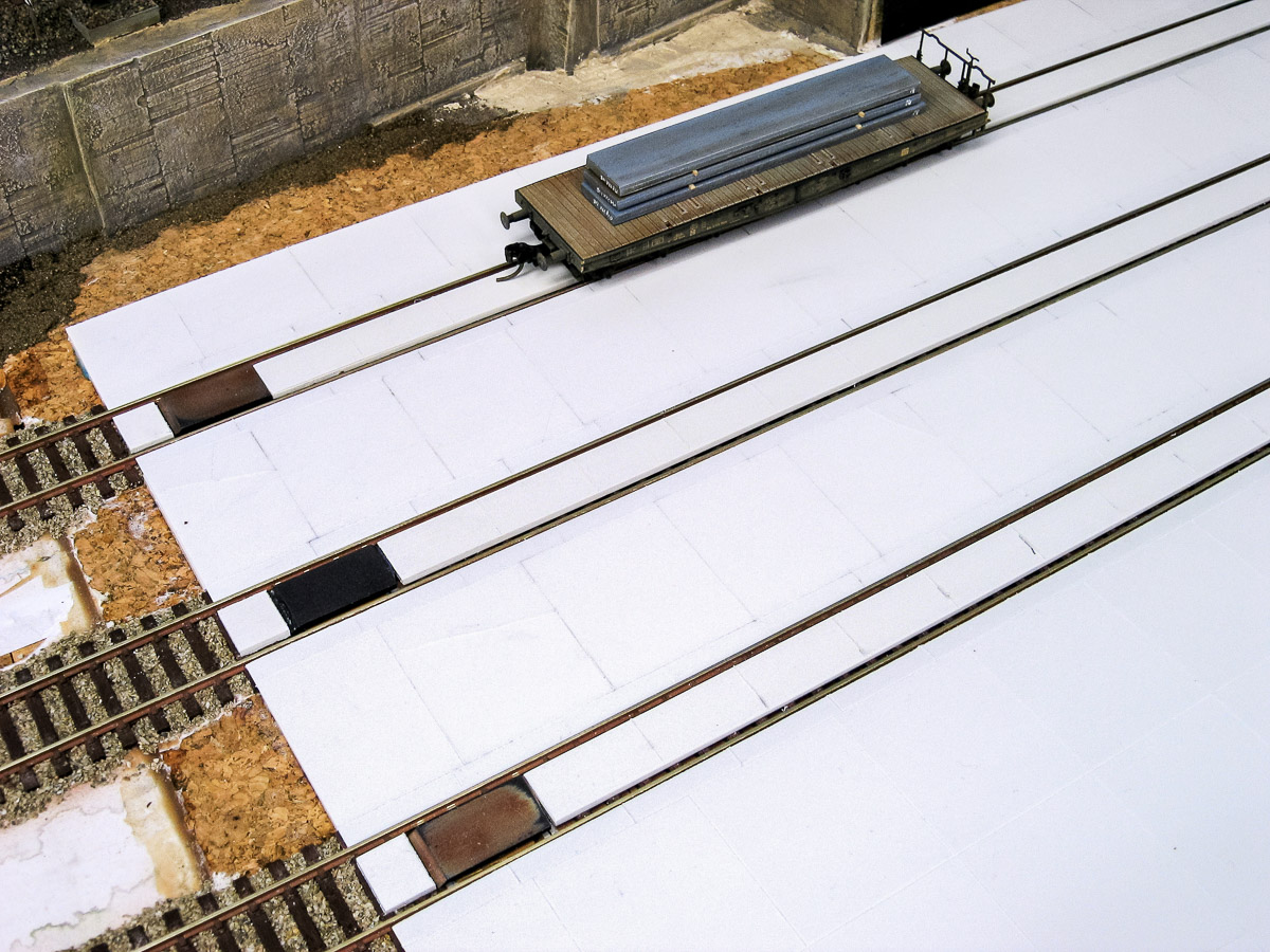 die Gleismitten abgedeckt. Dazu wurde 2mm dickes Polystyrol verwendet und in dünnen Streifen geschnitten. Die Nachbildung der Vierkantschrauben auf der Gleisinnenseite