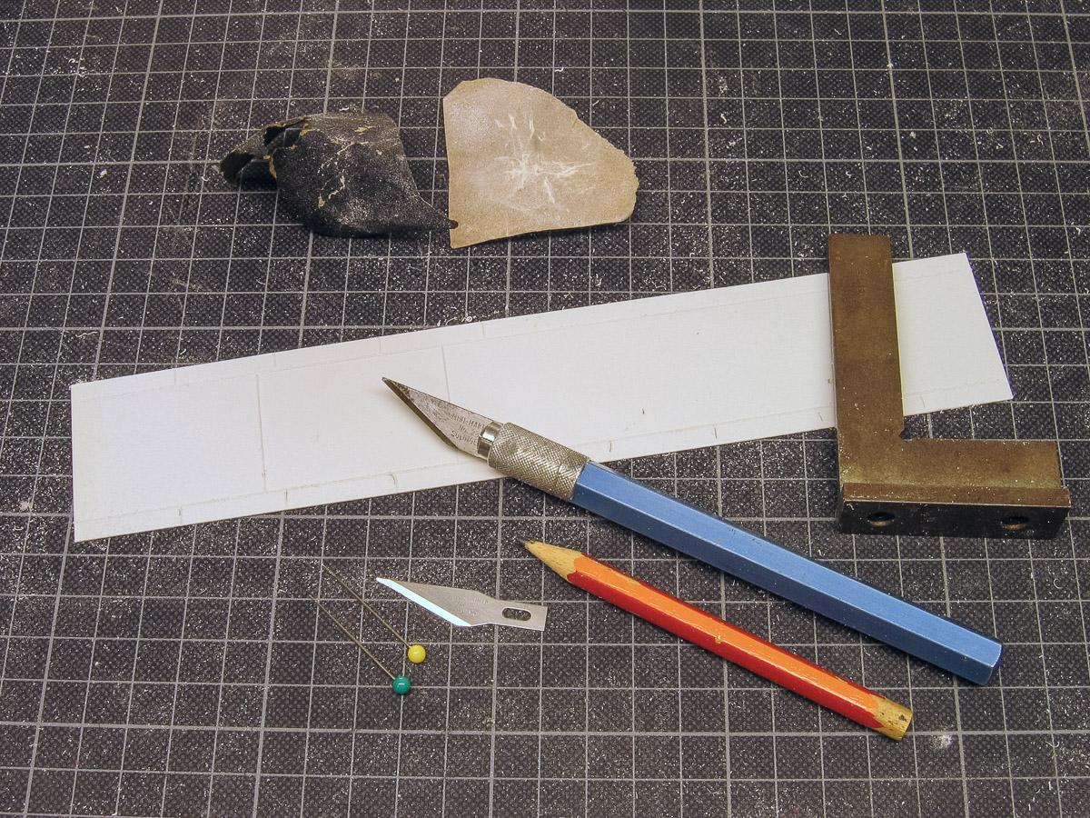 den nachgebildeten Betonplatten wurden mit einer stumpfen Klinge in die Deckschicht geritzt. Ein Stahllineal sorgte für eine genaue Linienführung.