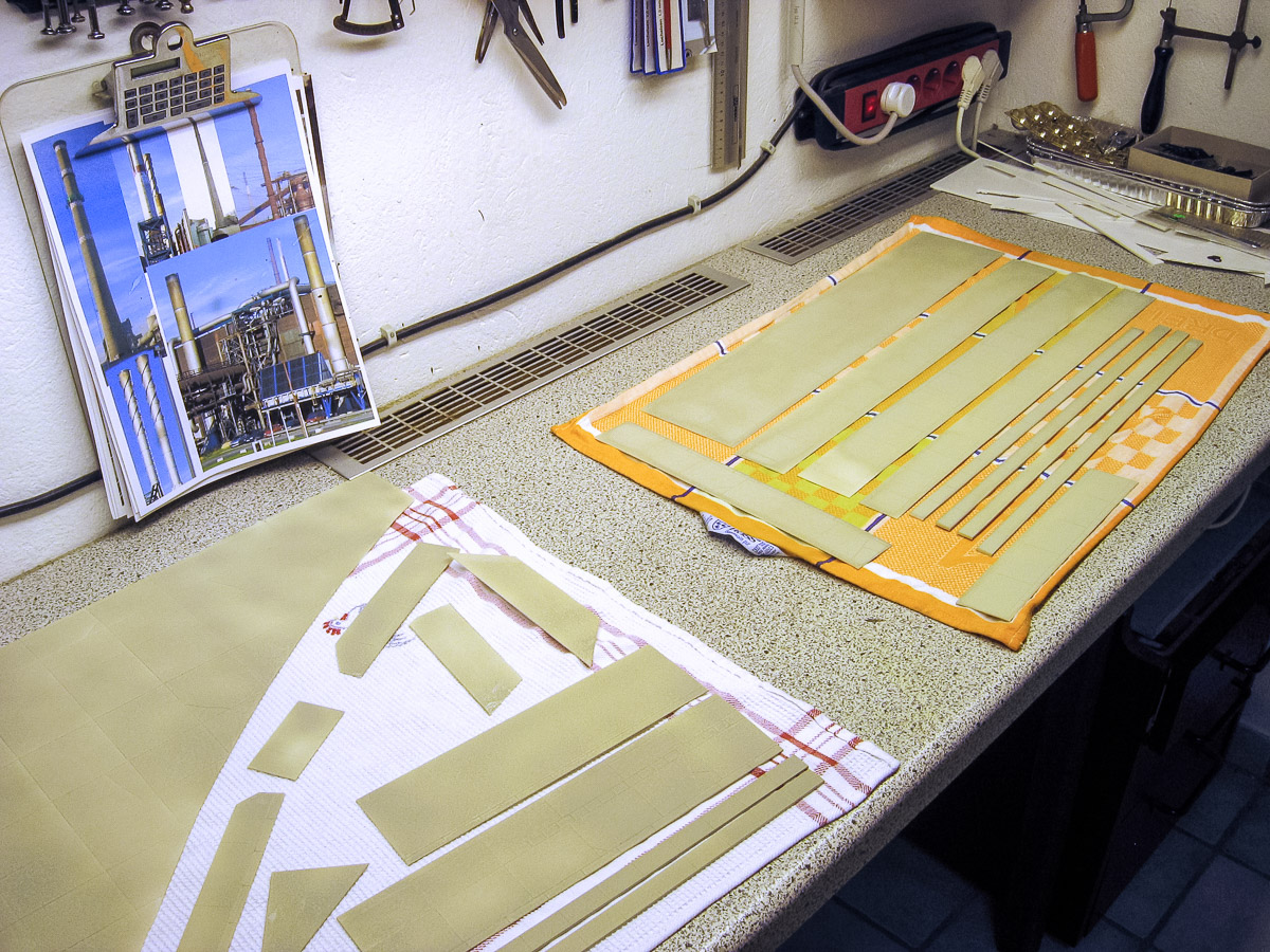 Schließlich wurdu aus 0,75mm dickem Material eine Deckschicht für das Fundament erstellt. Diese Platten reichen über die Kleineisen hinweg bis an die