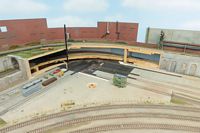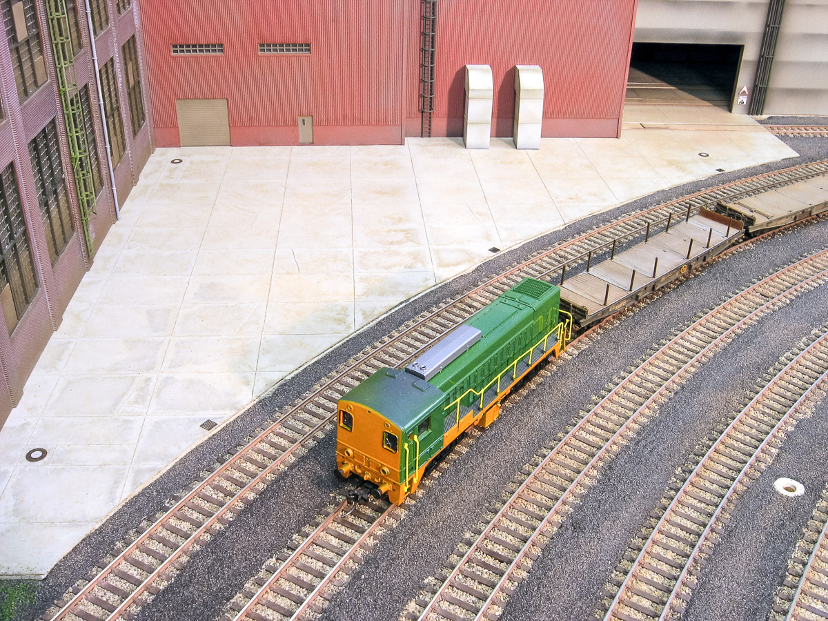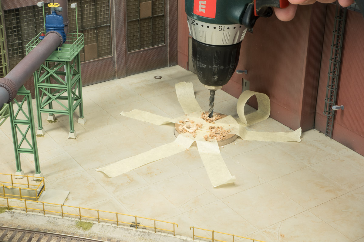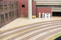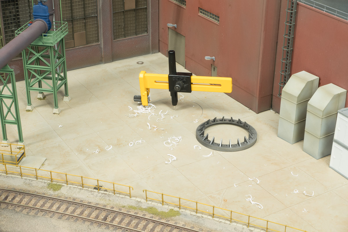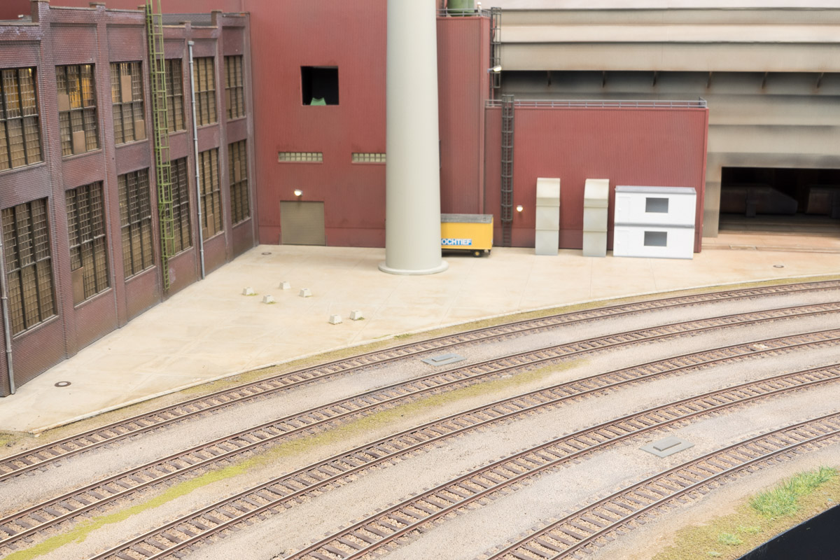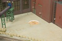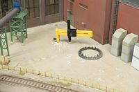 entlang der Gleisprofile und im Einfahrtbereich der Konverterhalle. Zum Schluß wurden geätzte Gullideckel aufgeklebt und die Betonplatte war fertig.