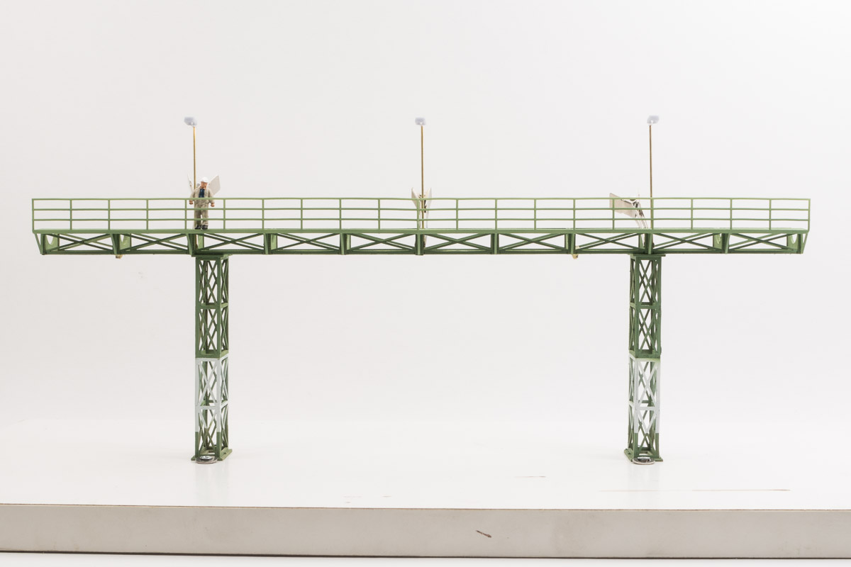Stabilität. Die beiden 3D-Teile wurden dann angeklebt und die gesamte Konstruktion in RAL 6011 Resedagrün überlackiert. Die Stützen der Brücke erhielten weiße Schutzanstriche, da