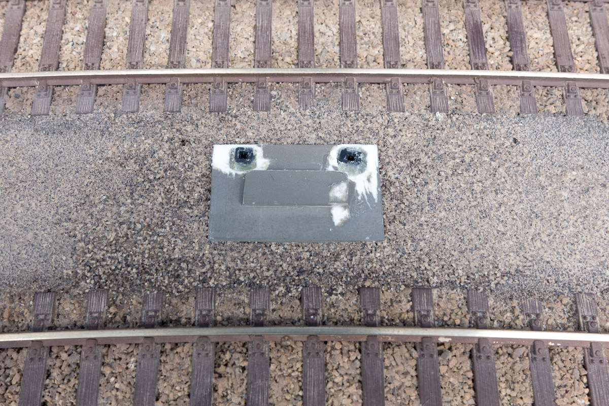 als die Kleineisennachbildung an den Schwellen. Das Fundament stößt bis an die Gleisschwellen und wurde mit Pattex auf den Korkuntergrund geklebt. Als nächstes wurden