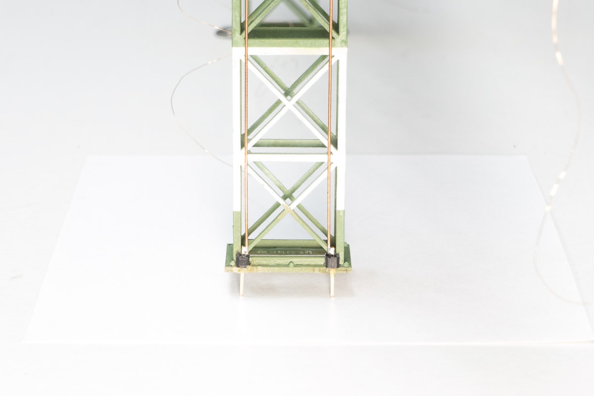 und die Lackdrähte verlaufen im Inneren. Nach ein paar Tests sind es dann drei Mastleuchten geworden, die an der Brücke festgeklebt und verkabelt wurden. Für die Stromversorgung wollte ich Kabel in