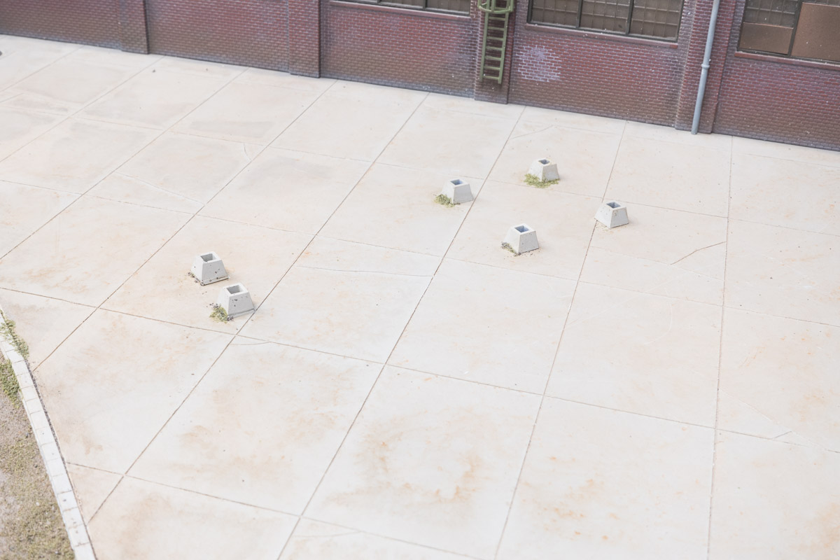 Die Betonflächen zwischen den Werkhallen entstanden aus Polystyrolplatten, die sich leicht verarbeiten ließen. Im ersten Schritt wurden die Fundamente aus