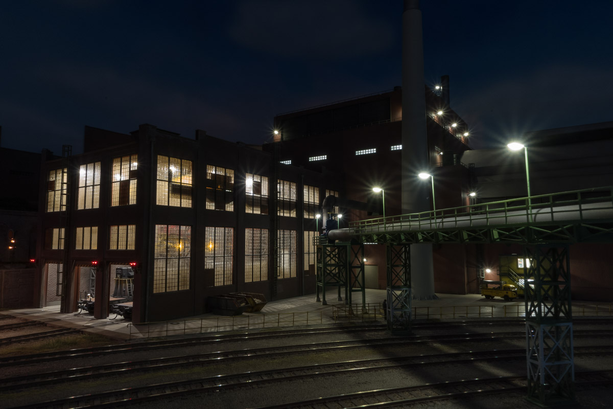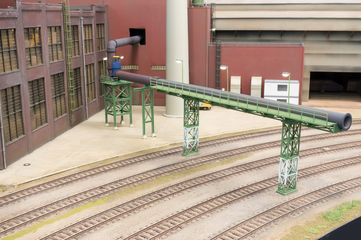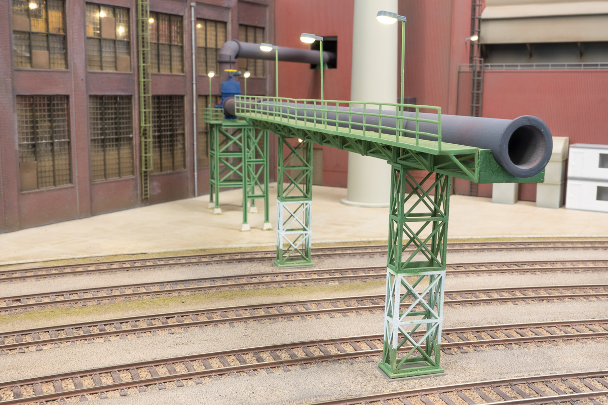 Zwischendurch erhielt der Wartungssteg der Rohrbrücke eine Beleuchtung. Dazu habe ich die Wandleuchten der Gießhalle zu Mastleuchten umgewidmet, die 3D-Lampenkörper sitzen auf 1mm Ms-Röhren