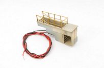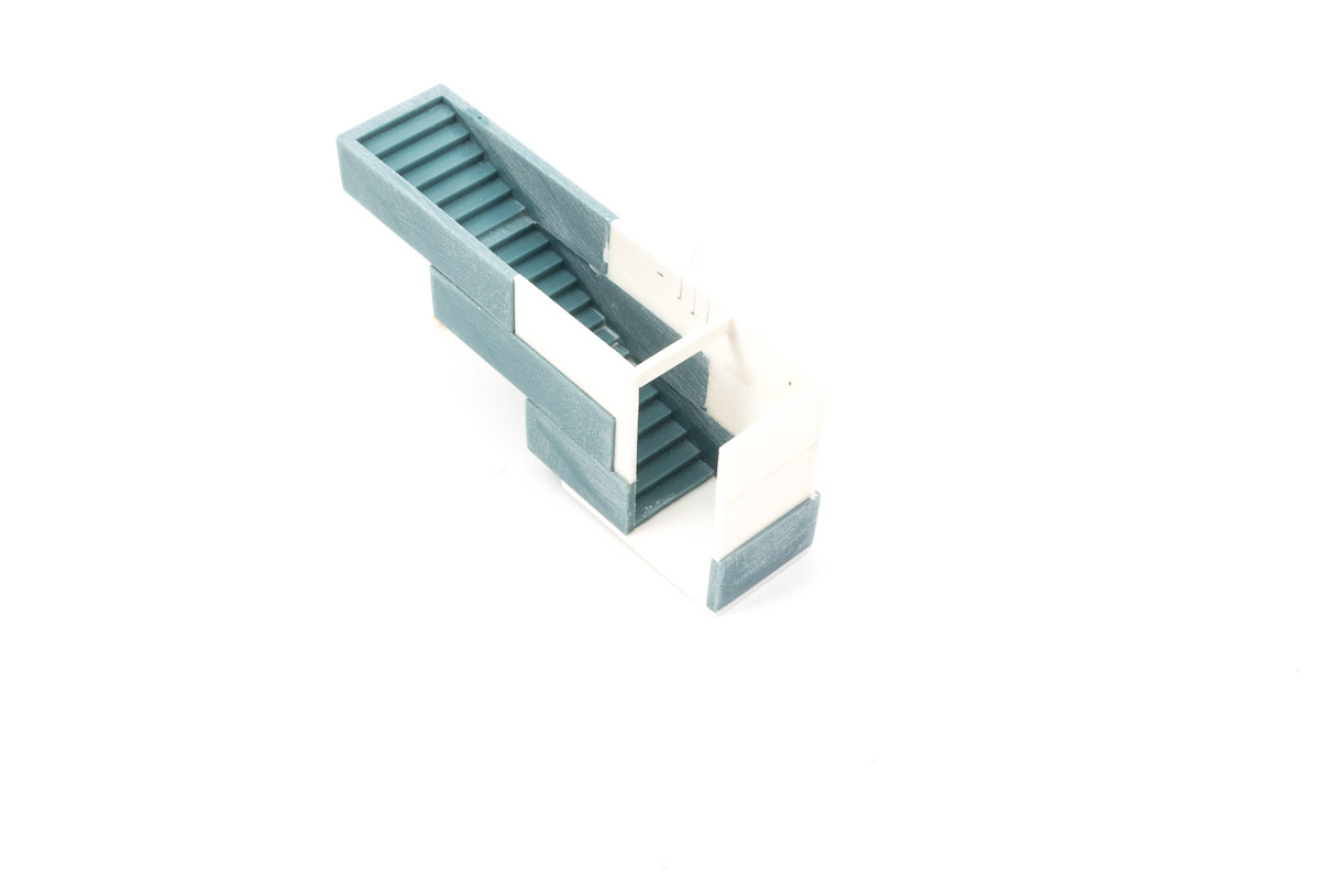 war überflüssig und schnell abgesägt. Die drei Treppenteile wurden passend aufeinander gestapelt und miteinander verklebt. Die vorhandenen Lücken und fehlenden Wandteile wurden aus 1 mm PS-Platten