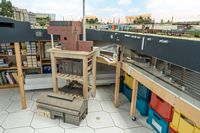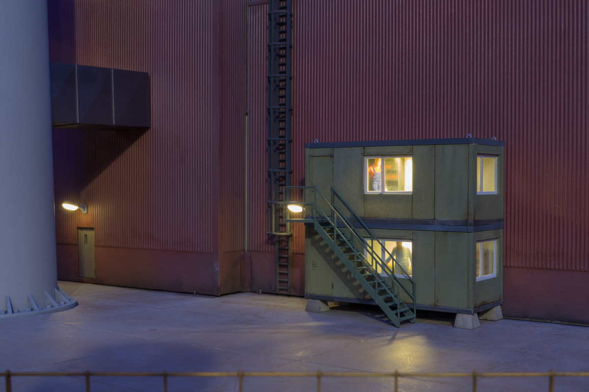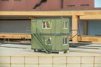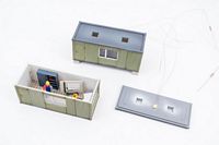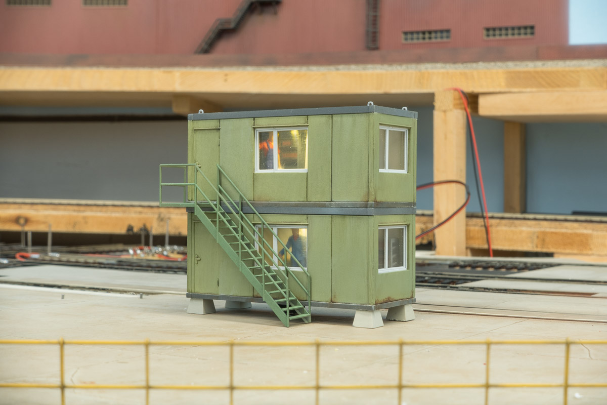 Die beiden Bürocontainer sind miteinander verklebt, bilden also ein Bauteil. An der Unterseite ist ein zweipoliger Steckkontakt für die Beleuchtung, damit die