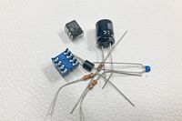 Netterweise hat mir mein Sohn eine kleine Blinkschaltung skizziert, die nötigen Bauteile fand ich praktischerweise in meinem Bauteile-Vorrat. Vier SMD-LED der Bauform 0603 habe ich an die