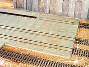 zu den Betonplatten mit feinem Sand gefüllt. Zu den Gleisen hin musste ich noch einige Lücken verspachteln, die Textur und Farbe der Oberfläche wurde dann mit alter Grill-Asche und etwas blaßgrünen