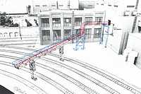 Ein Foto der Szene, auf DIN A4-Papier ausgedruckt, diente als Grundlage für eine Skizze. Die Rohrbrücke soll um einen Laufsteg ergänzt und die Rohrleitung ins benachbarte Gebäude verlängert