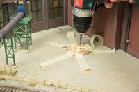 bereits befestigte Fundament geklebt. Die Abdeckungen der Gleismitten wurden ebenfalls mit Pattex befestigt. Dieser Flächenkleber ermöglichte Korrekturen, bevor die