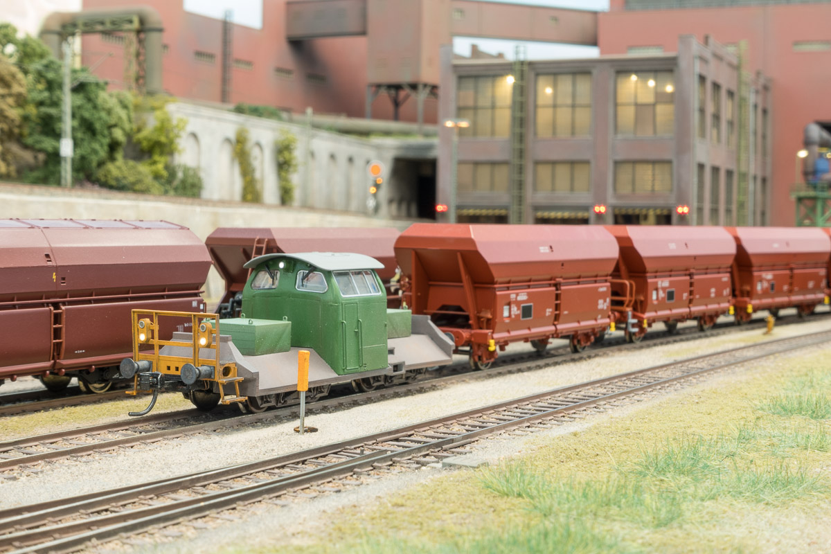 Die Vorstellwagen im Modell sind aus einem V100-Führerhaus und einem V60-Führerhaus von Roco, Drehgestellen von alten Roco-Selbstentladern sowie einem Chassis und Rangiererbühnen im 3D-Druck
