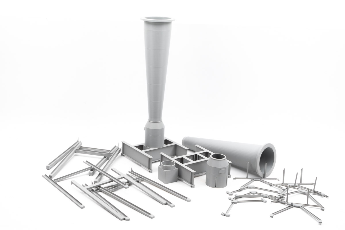 Im Modell orientiere ich mich weitgehend an der Situation in der Henrichshütte. Je eine Kombination aus Staubsack und Wirbler steht rechts und links neben dem Hochofen, dabei