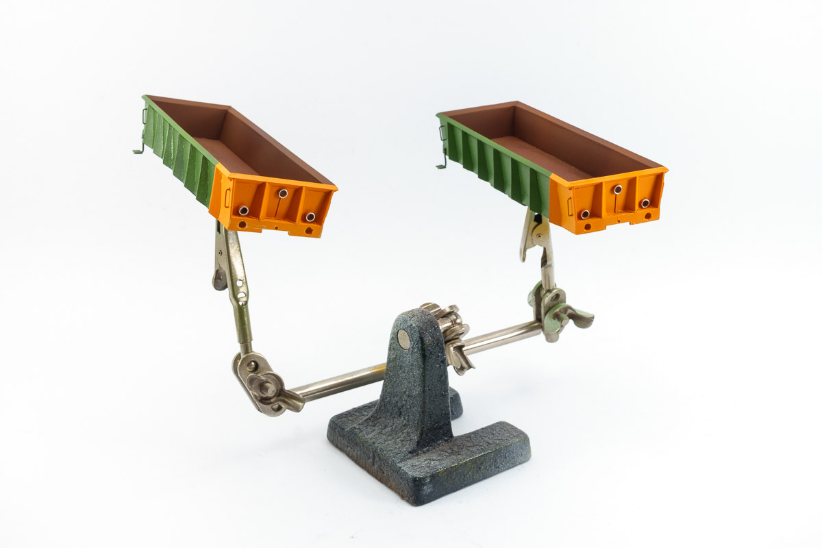 Anschließend wurden die Wagen in den Werksfarben der Phoenix Hüttenbahn grün und am vorderen Wagenende orange lackiert. Auf Warnstreifen verzichtete ich hier. Die Wageninnenseite