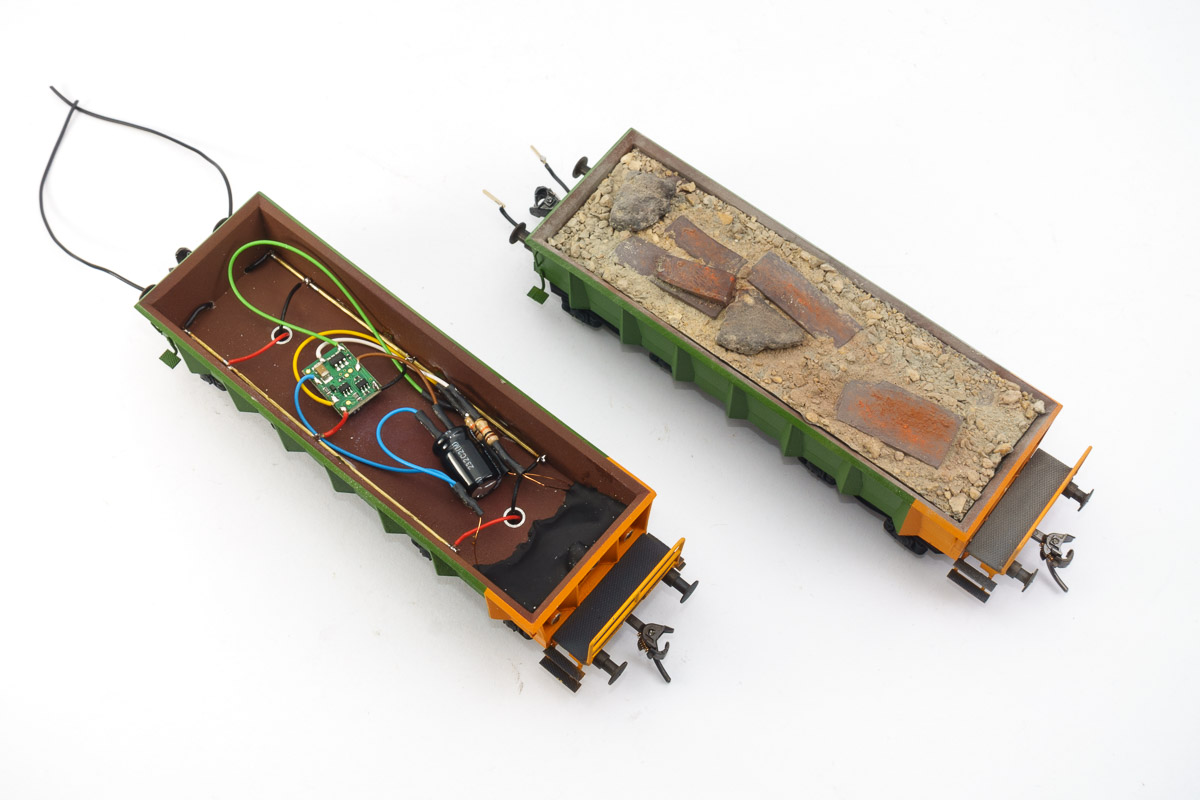 Beim Vorbild findet man in den Bremswagen viele Tonnen Ballastmaterial. Das ist meist ein Gemisch aus Schrott und Schutt, der im Stahlwerk in großer Menge
